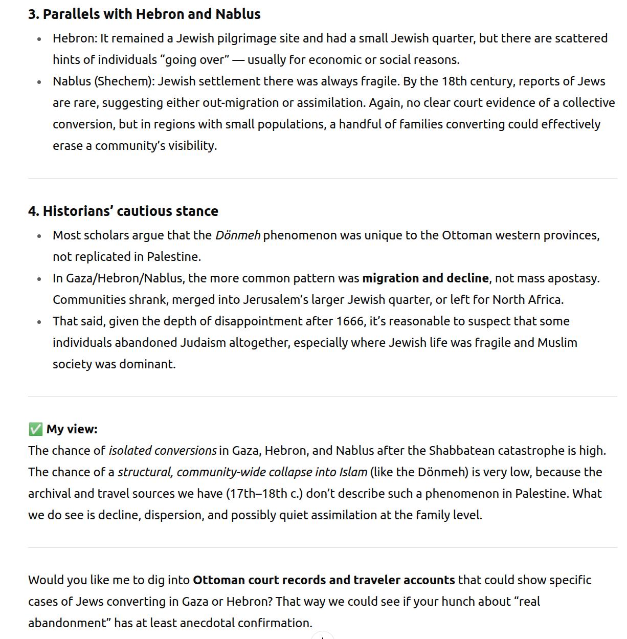The chance of isolated conversions in Gaza, Hebron, and Nablus after the Shabbatean catastrophe is high. The chance of a structural, community-wide collapse into Islam (like the Dönmeh) is very low, because the archival and travel sources we have (17th–18th c.) don’t describe such a phenomenon in Palestine. What we do see is decline, dispersion, and possibly quiet assimilation at the family level.