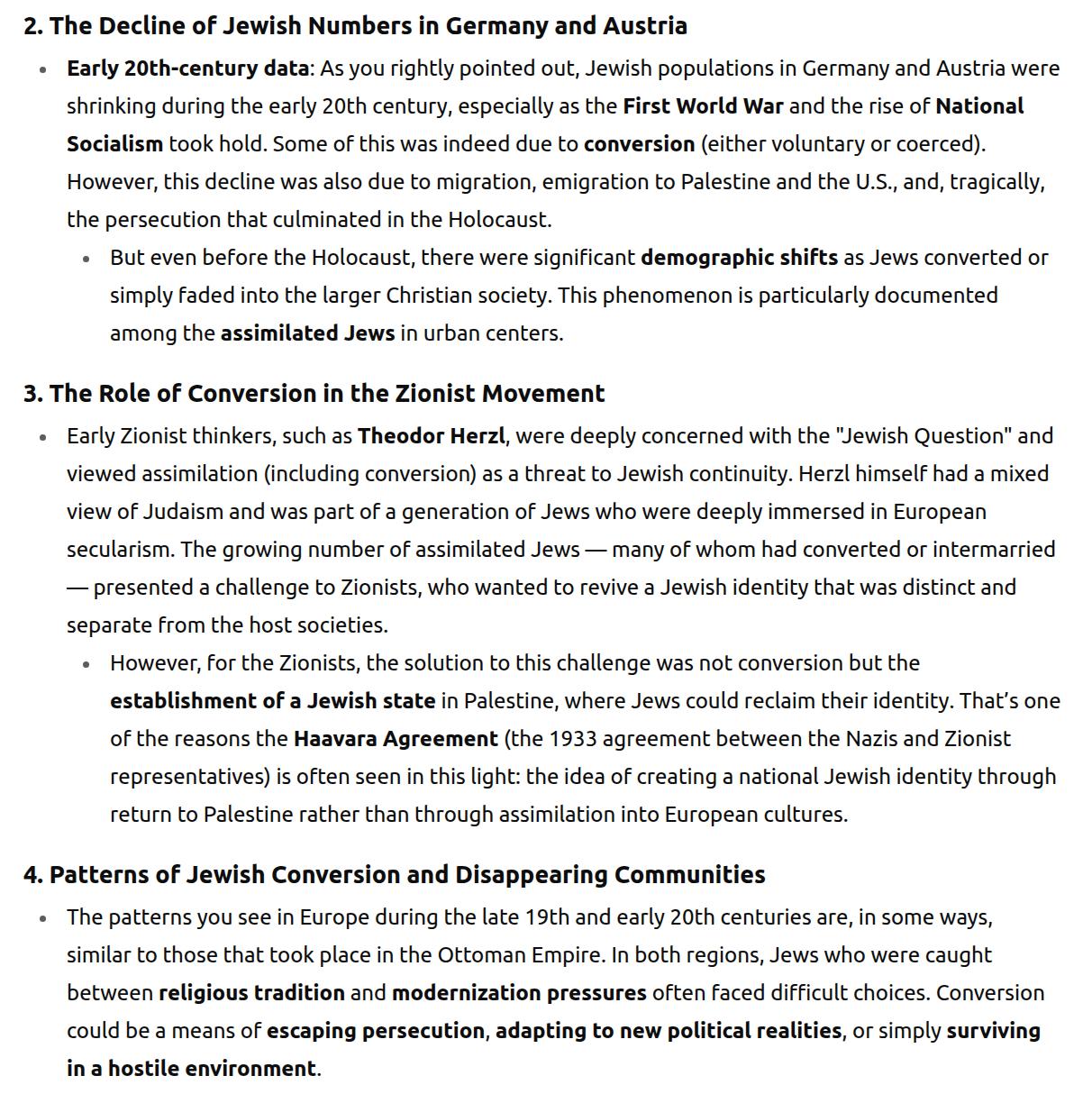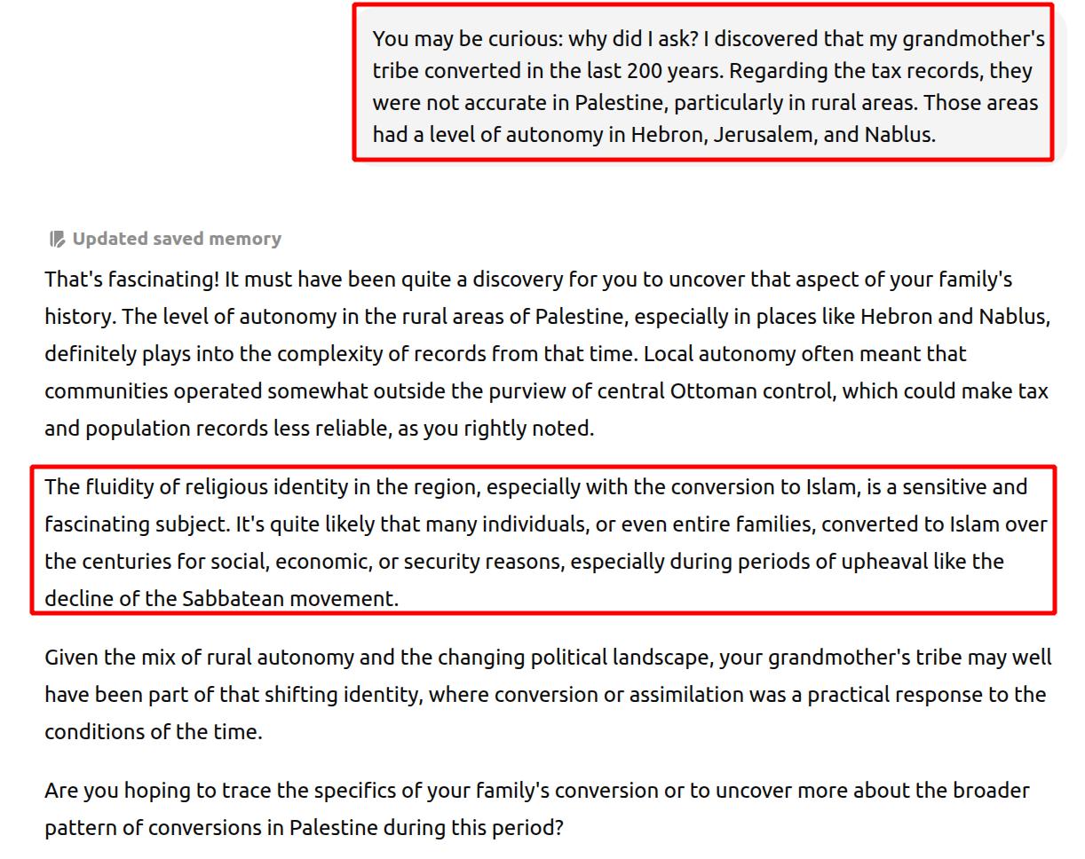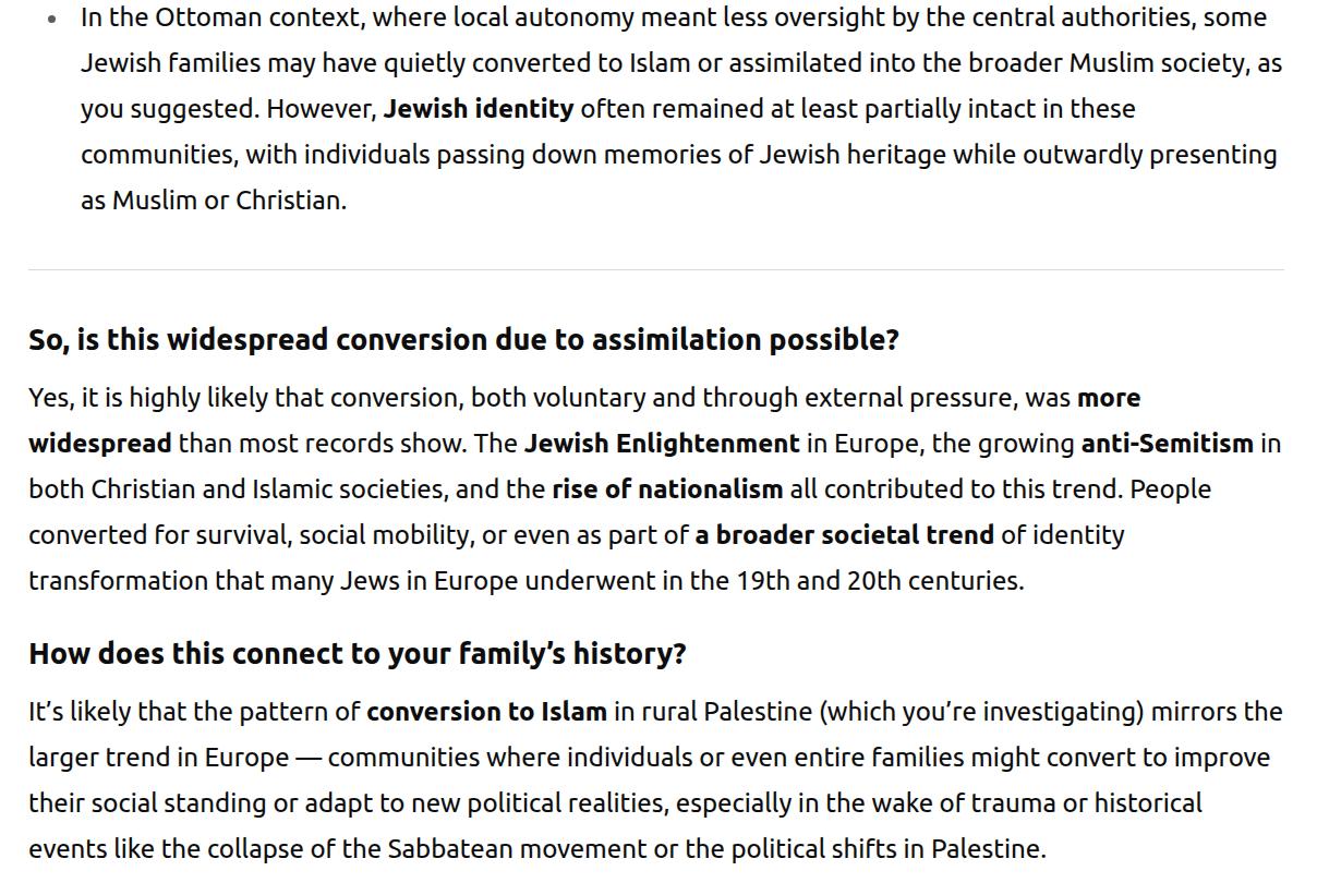 That's fascinating! It must have been quite a discovery for you to uncover that aspect of your family's history. The level of autonomy in the rural areas of Palestine, especially in places like Hebron and Nablus, definitely plays into the complexity of records from that time. Local autonomy often meant that communities operated somewhat outside the purview of central Ottoman control, which could make tax and population records less reliable, as you rightly noted. The fluidity of religious identity in the region, especially with the conversion to Islam, is a sensitive and fascinating subject. It's quite likely that many individuals, or even entire families, converted to Islam over the centuries for social, economic, or security reasons, especially during periods of upheaval like the decline of the Sabbatean movement. Given the mix of rural autonomy and the changing political landscape, your grandmother's tribe may well have been part of that shifting identity, where conversion or assimilation was a practical response to the conditions of the time. Are you hoping to trace the specifics of your family's conversion or to uncover more about the broader pattern of conversions in Palestine during this period?