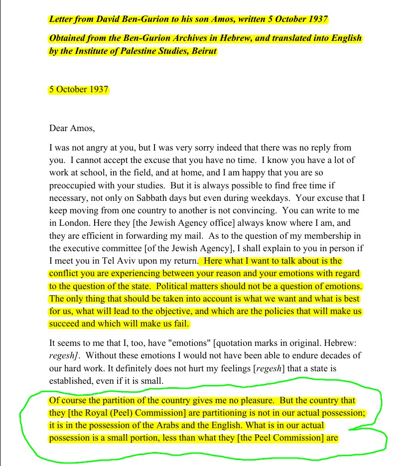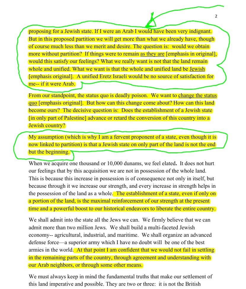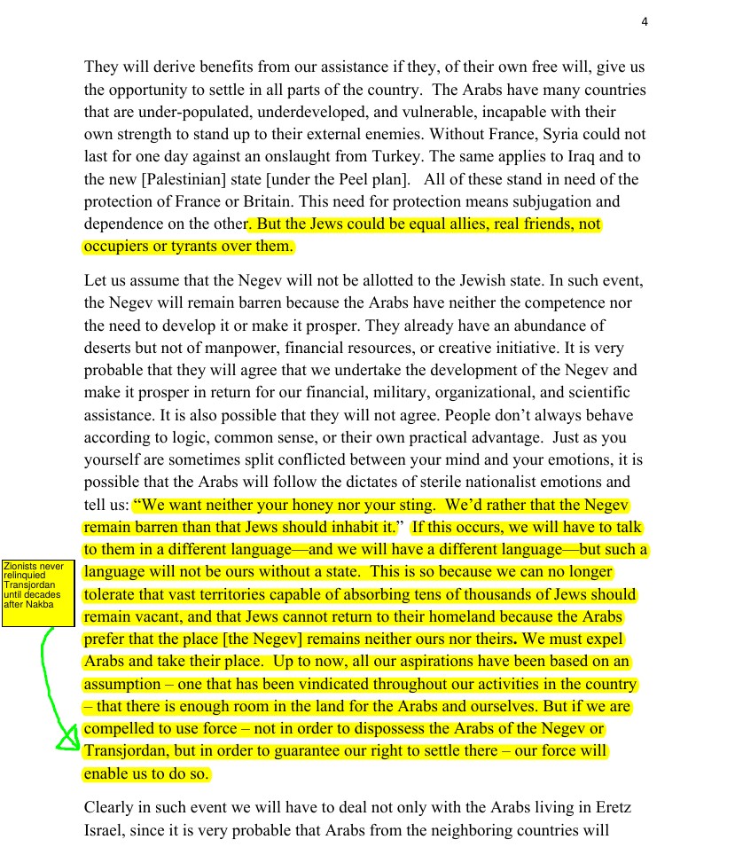 D) The original version of this letter was doctored to imply that Ben-Gurion was not planning a Nakba for Palestinians. Here is a brief rebuttal which is well documented at length at Wikipedia: 1) Israeli historians (Shabtai Teveth, Benny Morris, Ilan Pappe, and several others) deemed it to be doctored (here is a saved version) because Ben-Gurion is not known to add corrections to his handwritten letters, 2) Pappe found another version with similar intentions to drive Palestinians out of their homes and lands, 3) Teveth translated a version (before Morris reported it) but it didn't have the corrections whatsoever, and most importantly the 4) so-called correction doesn't jive with the rest of the meaning and spirit of the letter.