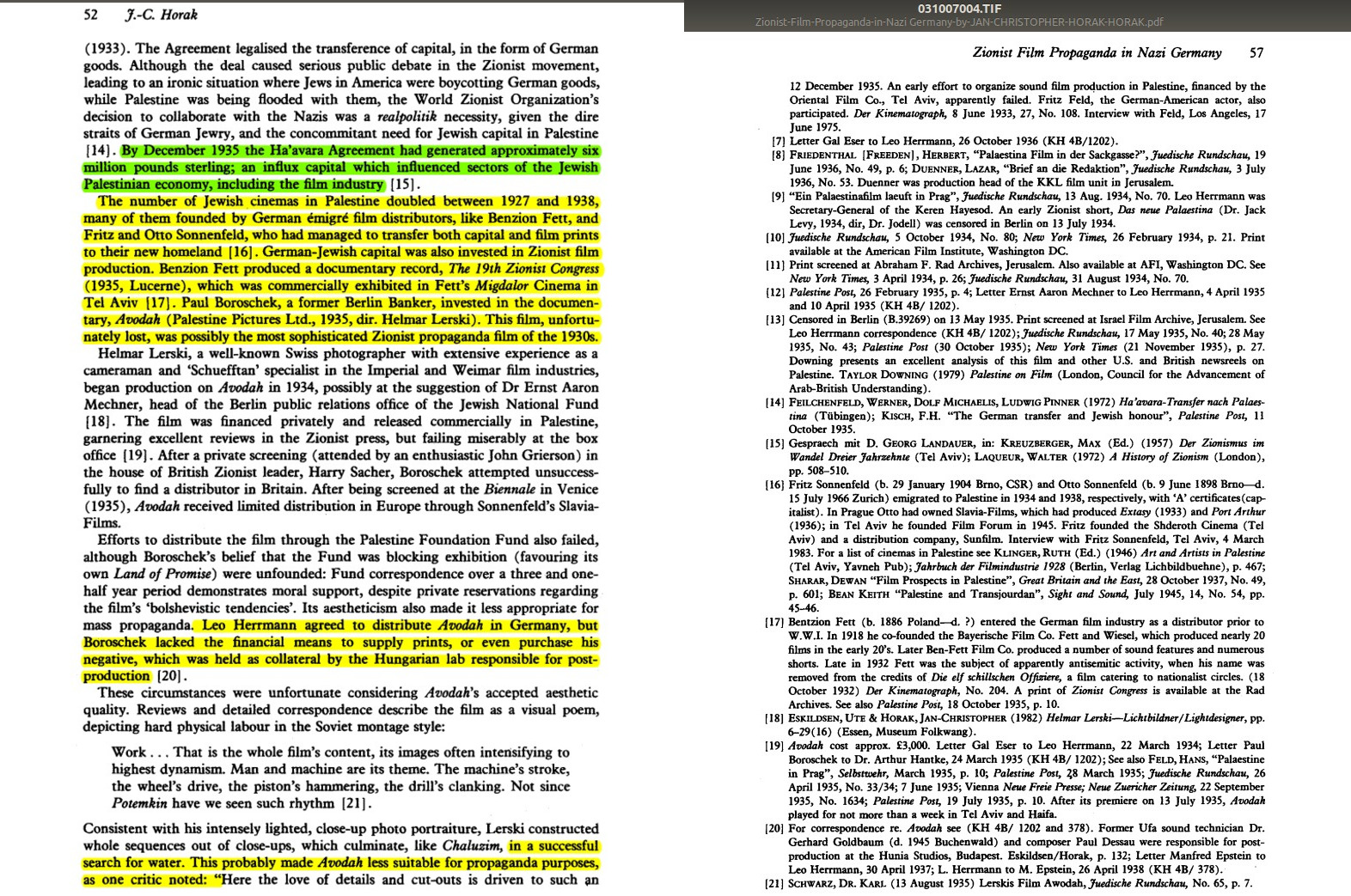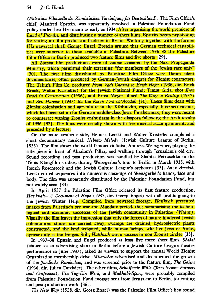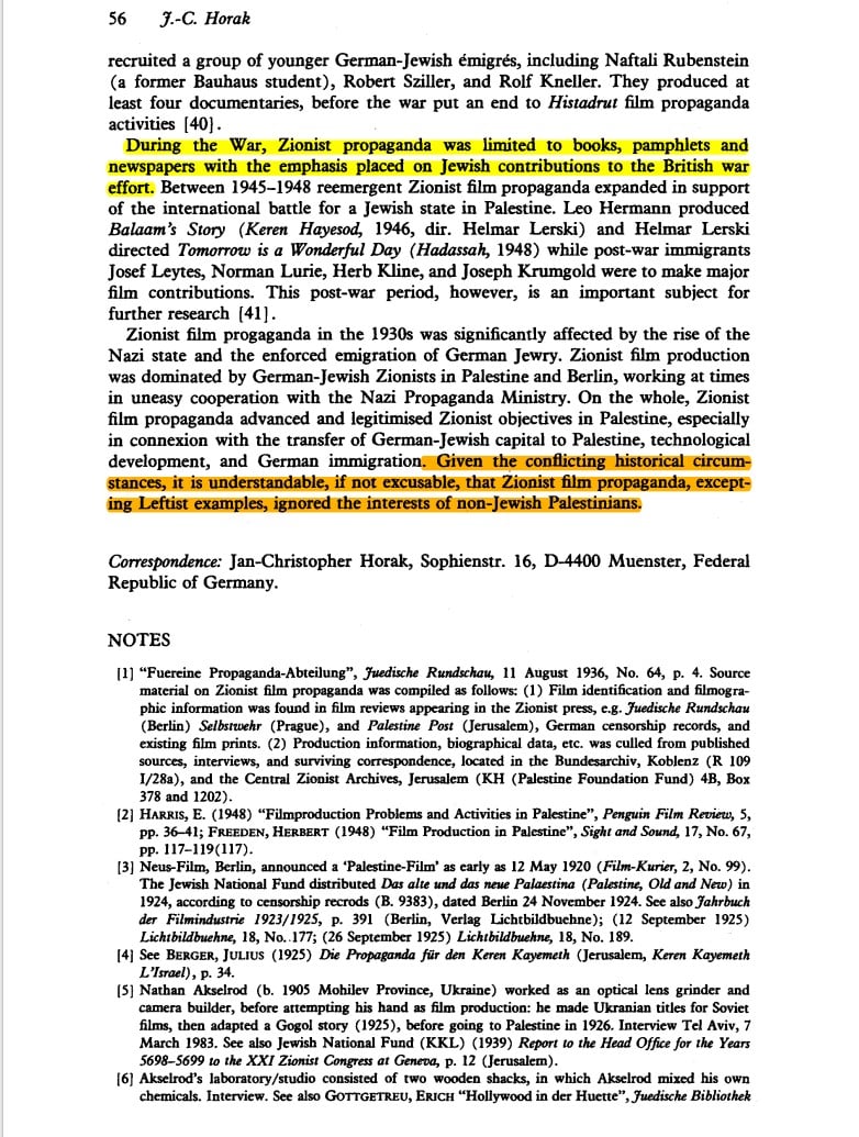 - Paper: Zionist Film Propaganda in Nazi Germany by Jan C. Horak (A Must Read). Pay attention to the last paragraph on p. 56, where Jan pointed out how Zionist propaganda films in the 1930s intentionally erased the indigenous people! As if anything has changed!