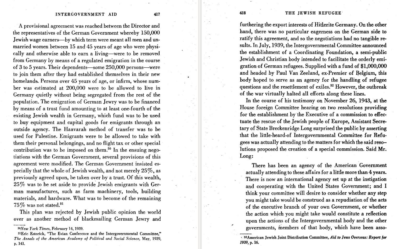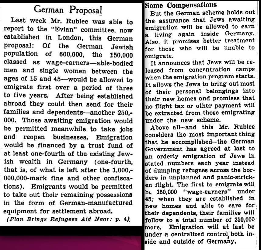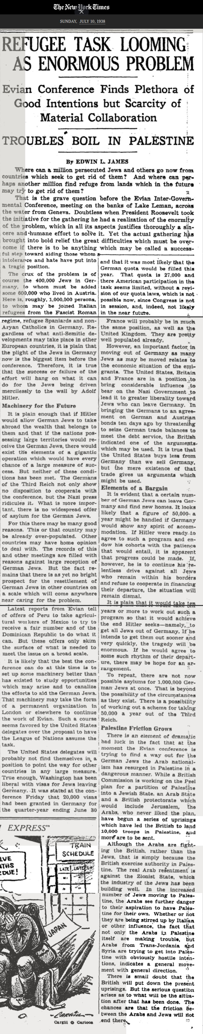 - NYTimes: REFUGEE TASK LOOMING AS ENORMOUS PROBLEM: Evian Conference Finds Plethora of Good Intentions but Scarcity of Material Collaboration, July 10th, 1938