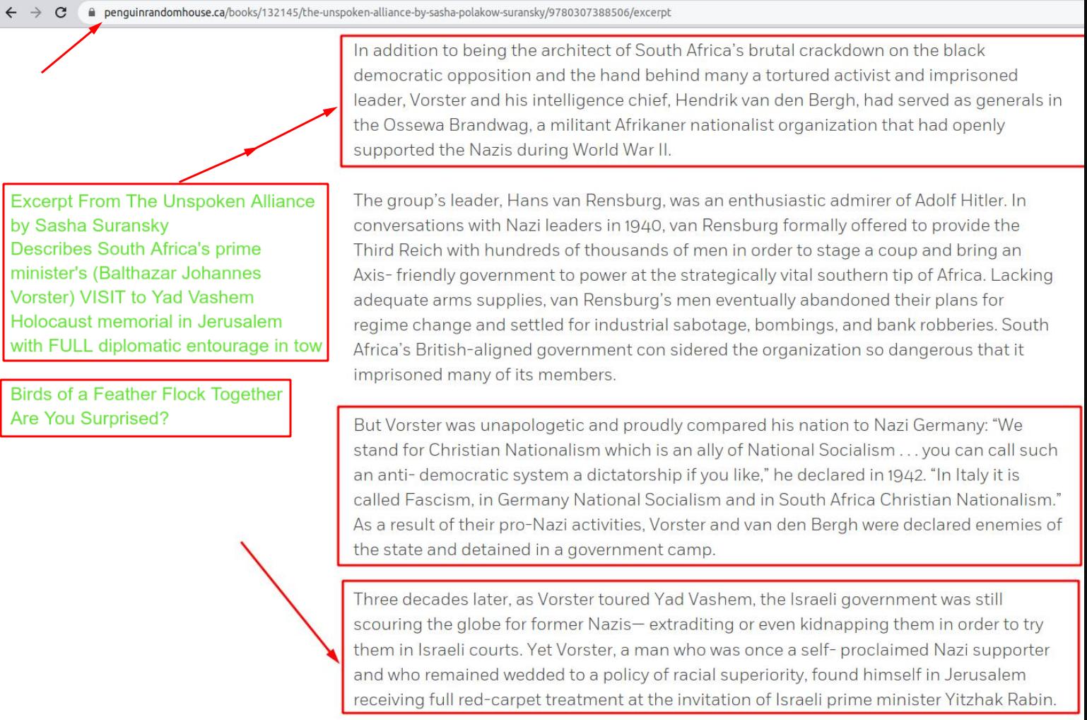 - Excerpt From the Book The Unspoken Alliance by Sasha Polakow-Suransky. Here is a C-SPAN interview with the author, which was recorded in 2010. The book deals with Zionists alliances with Nazi supporters in South Africa during apartheid.