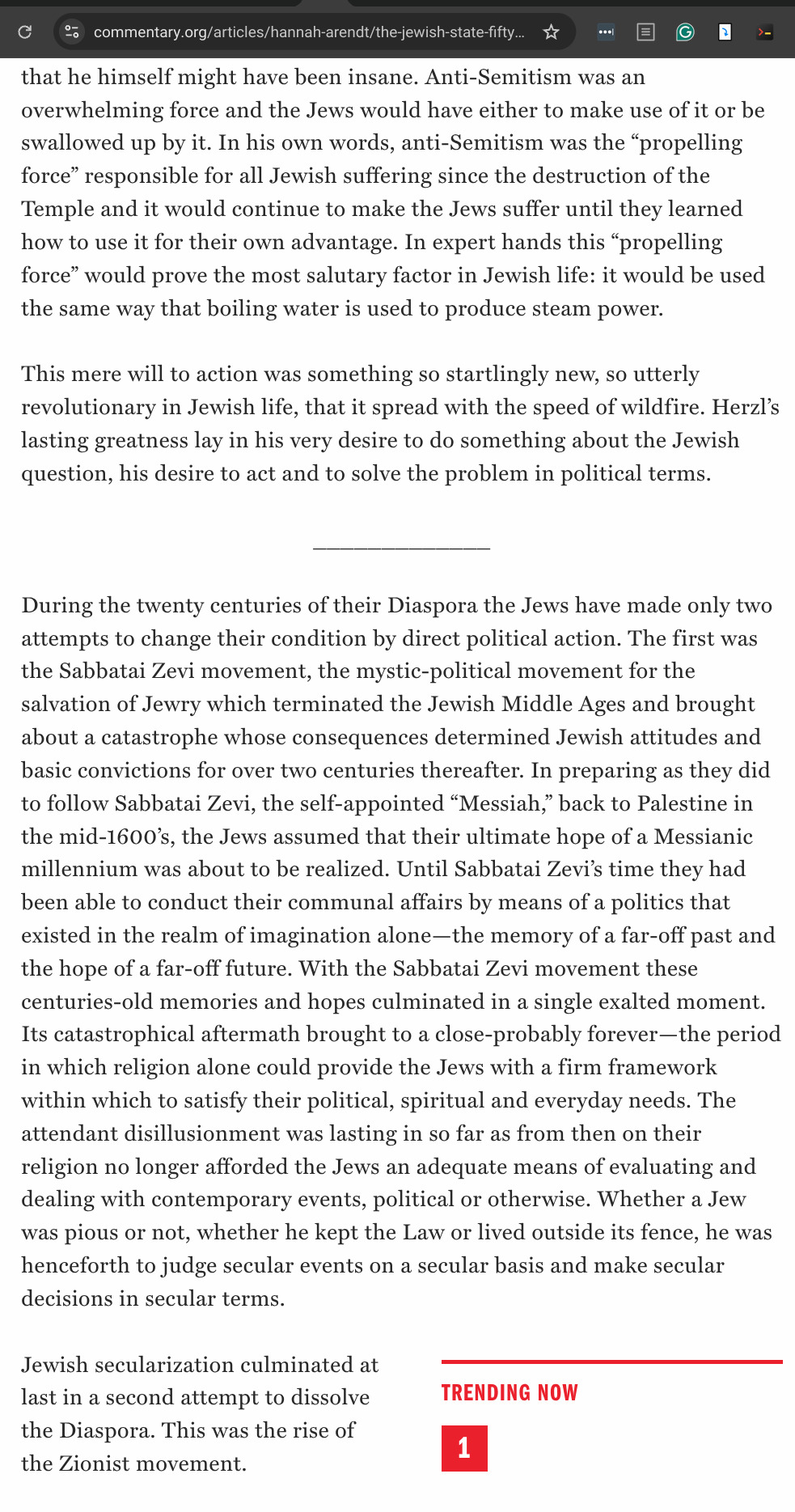 - FOREIGN AFFAIRS: The Jewish State: Fifty Years After, Rereading Herzl's The Jewish State today is a peculiar experience. MAY 1946 --by Hannah Arendt. A Must Read