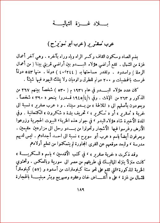 القرية قبل النكبة (كي لا ننسى للدكتور وليد الخالدي)كانت القرية تنتشر على رقعة مستوية من الأرض في السهل الساحلي, إلى الشمال الشرقي من إسدود ولعل اسمها محرف من اسم شكرون الكنعاني, كانت عرب صقرير قرية في ناحية غزة( لواء غزة)و وفيها 55 نسمة. وكانت تدفع الضرائب على عدد من الغلال كالقمح والشعير والسمسم بالإضافة إلى عناصر أخرى من الإنتاج كالماعز وخلايا النحل. وكان سكانها الأصليين من البدو المسلمين الذين استوطنوا الموقع بالتدريج, فبنوا المنازل الحجرية وأضحوا مزارعين. في 1944\1945 , كان ما مجموعه 583 دونما من أراضيهم مخصصا للحمضيات والموز و10232 دونما للحبوب, و489 دونما مرويا أو مستخدما للبساتين. إحتلال القرية وتطهيرها عرقياكانت عرب صقرير هدفا لأول اقتراح عملاني من الهاغاناه يدعو إلى تدمير قرية تدميرا كاملا, وكان ذلك في 11 كانون الثاني\ يناير 1948. وقد جاء في تقرير للاستخبارات يحمل هذا التاريخ, الاقتراح التالي: (يجب تدمير القرية كليا, وقتل بعض الذكور من تلك القرية نفسها). ويقول المؤرخ الإسرائيلي بني موريس إن التقرير جاء نتيجة (مقتل 11 فردا من كشافة الهاغاناه في 9 كانون الثاني \ يناير) غير أن التقارير الصحافية في تلك الآونة أوردت رواية مختلفة. فقد استشهدت صحفية(نيويرك تايمز) بمصادر من الشرطة تقول إن جماعة من اليهود من مستعمرة يفنه القريبة, هاجمت (وادي صقرير) بالأسلحة النارية في 9 كانون الثاني\ يناير, مضيفة أن الشرطة وصلت إلى المكان وردت على الهجوم. وجاء في التقارير أن ثمانية من العرب وأثني عشر يهوديا قتلوا, وكانت هذه ((الأكثر الاشتباكات قتلا)) في ذلك اليوم. أما صحيفة (فلسطين) الصادرة في يافا, فقد ذكرت أيضا هجوما على القرية في 9 كانون الثاني\ يناير. ولا يذكر موريس هل تم تنفيذ ذلك الهجوم (الانتقامي) أم لا غير أن أعضاء في الهاغاناه نسفوا 15 أو 20 منزلا في قرية عربية بالقرب من يبنة. ولا يورد التقرير أية أرقام عن الإصابات لكنه يستشهد ببعض من يقول إن التفجيرات التي حدثت فجرا كانت تهدف إلى الثأر للهجمات على القوافل اليهودية. ومن المرجح أن يكون القطاع الساحلي الذي تقع القرية فيه, وقع تحت سيطرة الهاغاناه يوم سقطت قرية بشيت المجاورة أي في 10 أيار\ مايو 1948 تقريبا. وقد احتل لواء غفعاتي المنطقة بكاملها بينما كان يوسع رقعة انتشاره إلى الجنوب والغرب, في أثناء عملية براك (أنظر البطاني الغربي, قضاء غزة). لكن موريس كتب يقول إن القرية لم تدمر إلا في 24-28 آب أغسطس, خلال عملية نيكايون(التطهير) التي قام لواء غفعاتي بها أيضا. وقد استغل هذا اللواء الهدنة الثانية في الحرب( لطرد جميع الأشخاص غير المسلحين من المنطقة), وذلك بموجب أوامر, لذا فإن الوحدات نسفت المنازل الحجرية وأشعلت النار في الأكواخ (وقتل عشرة من العرب في أثناء محاولتهم الفرار). القرية اليومتغطي الأعشاب البرية وبعض نبات الصبار والأشجار الموقع. وثمة منزلان بقيا قائمين, أحدهما يقع وسط بستان للحمضيات, وله هيكل من الأسمنت وحيطان, وعلى سطحه (علية) وهي إما غرفة نوم مفردة لصاحب المنزل, وإما غرفة للضيوف وتوجد عادة في منازل أثرياء القرى رمزا للثراء أو المكانة. وثمة سلم يستند إلى الحائط الجانبي المتداعي. المغتصبات الصهيونية على اراضي القريةثمة مستعمرتان على أراضي القرية: نير غليم (12137) التي أقيمت في سنة 1949, وأشدود (116134) التي أقيمت في سنة 1955, أما مستعمرة بني دروم (121136), التي أقيمت في سنة 1949, فهي تجاورها من جهة الشرق على أراضي كانت تابعة لمدينة إسدود. |
