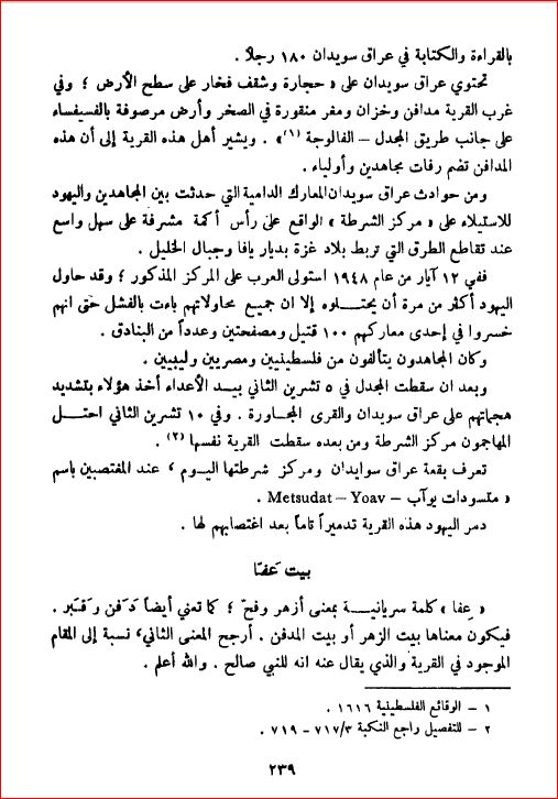 غير أن كتاب (تاريخ حرب الاستقلال) يورد أن القرية كانت في يد الاسرائيلين في 9 تموز \ يوليو أي بينما كانت الهدنة الأولى تشارف على الانتهاء. وكانت تحتلها فصيلة من الكتيبة الثانية في لواء غفعاتي. لكن الجيش المصري احتلها في ذلك التاريخ, بعد أن مارس (ضغوطا استمرت حتى الصباح) وجاء في رواية الهاغاناه أن الكتيبة الرابعة في اللواء المذكور حاولت احتلال القرية من جديد بعد ذلك بأسبوع أي في 17- 18 تموز \يوليو لكنها أخفقت على الرغم من أنها كانت معززة بإنزال بحري. وتضيف الرواية ( أن المصريين كانوا يعلمون تمام العلم أهمية هذه القرية الحيوية, ولذلك حصنوها تحصينا جيدا) غير أن الكاتب المصري محمد عبد المنعم يقول إن احتلال إسرائيل للقرية تم بعد ذلك بيومين أي خلال ليل 10-11 تموز\ يوليو, عندما انتزعت القرية من أيدي المجاهدين الفلسطينيين المؤكل إليهم الدفاع عنها. ويضيف عبد المنعم أن القوات المصرية النظامية استعادت القرية صباح اليوم التالي(11 تموز\يوليو). ويؤكد ذلك تقرير نشرته صحيفة (نيورك تايمز) وجاء فيه أن بيت عفا سقطت أولا في يد الاسرائيلين في 9 تموز\يوليو, ومعها عراق سويدان وعبدس, وأن القوات العربية استعادتها في اليوم التالي. وبعيد هذه المعركة زعم الإسرائيليون أنهم قتلوا 300 من الجنود المصريين والسودانيين وأنهم أسروا 200 آخرين.