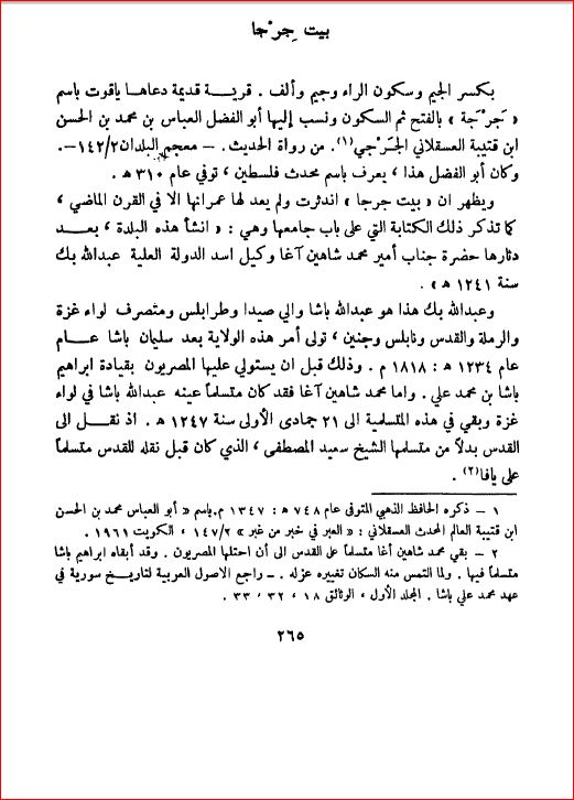 القرية قبل النكبة (كي لا ننسى للدكتور وليد الخالدي)كانت القرية مبنية على رقعة مستوية من الأرض في السهل الساحلي الجنوبي ويخترق أحد الأودية الغربي. وكانت بيت جرجا تقع على بعد نحو كيلومتر من الطريق العام الساحلي وهذا ما أتاح لها الاتصال بغزة والمجدل ويافا وغيرها من المدن كما كانت تبعد البعد نفسه تقريبا عن خط سكة الحديد الساحلي. وكان طرق فرعية عدة وطرق أخرى ترابية تربطها بالقرى المجاورة وقد سماها الجغرافي العربي ياقوت الحموي(توفي سنة 1229) وقال أنها مسقط رأس أبي المفضل الجرجي الذي كان في زمانه محدث فلسطين. في سنة 1596 كانت بيت جرجا (المسماه خطا بيت خرجا في الوثائق العثمانية) قرية في ناحية غزة(لواء غزة) وكان فيها 468 نسمة. وكانت تدفع الضرائب على القمح والشعير وأشجار الفاكهة والماعز وخلايا النحل وفي زمن ما اختفت القرية العثمانية فثمة نقش حجري في مسجدها يشير إلى أن بيت جرجا الحديثة أنشئت في سنة 1825 (أو في وقت يسبق ذلك بعض الشيء). وفي أواسط القرن التاسع عشر وصفت القرية بأنها قرية صغيرة وفيها جنائن وتتزود المياه من صهاريج ومن بركة. كان شكل القرية مماثلا لشبه المنحرف وكانت قاعدته الكبرى (حيث تم معظم التوسع) إلى الشمال الغربي وفي موازاة الطريق المؤدية إلى قرية بربرة المجاورة وكانت منازل بيت جرجا المبنية بالطين والطوب تتخللها أزقة ضيقة. أما سكانها فكانوا من المسلمين ويعتنون بمقام يعتقدون أنه قبر (النبي) جرجا ويقع في الطرف الشرقي مشرفا على وادي العبد. في سنة 1932, أنشئت مدرسة ابتدائية في القرية, أيضا بضعة متاجر صغيرة وكان بعض الآبار التي يتراوح عمقها بين 30 و80 مترا, يمد القرية بمياه الشرب والري وكانت الزراعة تقوم على الحبوب والخضروات والفاكهة في 1944\1945 , كان ما مجموعه 434 دونما مخصصا للحمضيات والموز و6911 دونما للحبوب و618 دونما مرويا أو مستخدما للبساتين. أما بقايا القرية قبل القرن التاسع عشر, بما في ذلك أسس المنازل القديمة وإحدى الآبار وهي التي كان الصليبيون يدعونها أموهده, تضم بقايا أو آون فخارية وبعض الصهاريج وبركة. إحتلال القرية وتطهيرها عرقيامن المرجح أن تكون بيت جرجا احتلت في أواخر عملية يوآف (أنظر بربرة, قضاء غزة) في أواخر تشرين الأول\ أكتوبر, أو أوائل تشرين الثاني\ نوفمبر 1948 .وظروف ذلك الاحتلال غير متاحة, إلا إن المؤرخ الإسرائيلي بني موريس يشير إلى أنها احتلت مع المجدل في 4-5 تشرين الثاني \ نوفمبر, أن لم يكن ذلك تم قبل هذا التاريخ بأيام قليلة. كما لم يعرف شيء عن مصير سكانها, إلا إن موريس يقول إن سكان المنطقة كلهم تقريبا فروا منها أو طردوا خلال هذه العملية في اتجاه قطاع غزة على الأغلب وقد قام بالأمر قائد القطاع الجنوبي الإسرائيلي وقائد البلماح يغال ألون, وذلك بموجب خطة (دالت). القرية اليوميحيط سياج من الأسلاك الشائكة بالموقع, ولم يبق ماثلا للعيان سوى الأزقة والركام. وما زال أحد المنازل قائما في الطرف الشمالي للقرية, مع بعض أشجار الجميز ونبات الصبار وبعض أراضي القرية مزروع بينما تغطي الأحراج بعضها الآخر. المغتصبات الصهيونية على اراضي القريةلا مستعمرات إسرائيلية على أراضي القرية. غير أن أراضي قرية بربرة المدمرة المجاورة لها, على ما يبدوا تتداخل مع أراضي بيت جرجا وهذا يعني أن المستعمرات الثلاث القائمة على أراضي بربرة(مفكيم وغيئا وتلمي يافي), قريبة من أراضي بيت جرجا. |