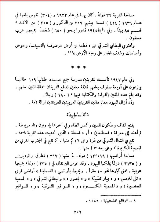القرية قبل النكبة (كي لا ننسى للدكتور وليد الخالدي)كانت القرية تقع في رقعة أرض مرتفعة من السهل الساحلي ومستوية في معظمها, على الطريق العام بين مدينة المجدل, إلى الجنوب الغربي, وطريق القدس- يافا العام. وكان المعسكر البريطاني, المعروف باسم بير توفيا, يقع على بعد 3كيلومتر إلى الجنوب الغربي من القرية. في سنة 1569, كانت قسطينة قرية في ناحية غزة (لواء غزة), وفيها 385 نسمة. وكانت تدفع الضرائب على عدد من الغلال كالقمح والشعير والسمسم والفاكهة, بالإضافة إلى عناصر أخرى من الإنتاج والمستغلات كالماعز وخلايا النحل وكروم العنب. وأشار الرحالة الشامي المتصوف مصطفى البكري الصديقي, الذي زار المنطقة في أواسط القرن الثامن عشر, إلى أنه مر بقسطينة في أثناء توجهه إلى المسمية( أنظر المسمية الكبيرة, قضاء غزة) (الرحلة) مذكور في الخالدي) في أواخر القرن التاسع عشر كانت قرية قسطينة تنتشر على أراض مستوية على محور شمالي غربي- جنوبي شرقي. وكانت أبنيتها من الطوب وفيها بئر وبساتين, وكان فيها مسجد ومدرسة ابتدائية أسست في سنة 1936, وكان تشترك فيها مع قرية تل الترمس المجاورة, والواقعة إلى الجنوب الشرقي. في أواسط الأربعينات, كان عدد التلامذة المسجلين فيها 161 تلميذا. أما سكان القرية فكانوا من المسلمين, ويتزودون المياه للاستعمال المنزلي من الآبار. وكانت الزراعة عماد اقتصادها, والحبوب والحمضيات أهم محاصيلها. في 1944\1945, كان ما مجموعه 235 دونما مرويا أو مستخدما للبساتين. وبالإضافة إلى ذلك, كان سكانها يربون الحيوانات والدجاج كما كانوا يعملون في المعسكر البريطاني. إحتلال القرية وتطهيرها عرقيااحتلت قسطينة في 9 تموز\ يوليو 1948 , أي بعيد انتهاء الهدنة الأولى وذلك على يد لواء غفعاتي حين تقدم جنوبا نحو الأراضي التي يسيطر المصريون عليها. وخلال الأيام العشرة بني الهدنتين(8-18-تموز\ يوليو), نجح اللواء في الاستيلاء على منطقة تشمل ست عشرة قرية على الأقل, وهجر سكانها كافة. ومن المرجح أن يكون سكان قسطينة, مثلهم في ذلك مثل سكان المسمية المجاورة, طردوا جنوبا نحو غزة لا شرقا نحو منطقة الخليل. وكانت أوامر العمليات التي أصدرها قائد اللواء شمعون أفيدان, تقضي بأن يطرد المدنيون. غير أن سكان المنطقة فروا منها حالما بدأت العملية تقريبا, وهذا اسنتادا إلى بلاغ عسكري إسرائيلي صدر لاحقا. وكانت خطة (دالت ) آتت إلى ذكر القرية ضمن القرى التي يهدف لواء غفعاتي إلى احتلالها. القرية اليوملم يبق منها سوى حطام المنازل المبعثر في أنحاء الموقع فقد زار الموقع فري الباحثين الذي يدقق في الوضع الراهن للقرى المهجورة, ووجده مغطى بالأعشاب البرية والحشائش الطويلة التي وصل ارتفاعها إلى مترين. وكان نبات الخبيزة وهو نبات بري يطبخه الفلاحون الفلسطينيون ويستخدمونه في مآكلهم, ينتشر بكثافة وعندما عاد المصور الفوتوغرافي إلى الموقع في وقت لاحق وجد أن الخبيزة أحرقت. أما معالم المواقع الأخرى, فلم تتغير إذا لا تزال هناك طريق غير معبدة تمر وسط الموقع, الذي تغطيه أشجار الكينا. المغتصبات الصهيونية على اراضي القريةفي سنة 1939 أقام لاجئون يهود, من ألمانيا وأوروبا الوسطى وأوروبا الشرقية مستعمرة كفار فاربورغ (124125)على أراض كانت تابعة تقليديا للقرية, على بعد 3 كيلومترات إلى الجنوب الغربي من موقعها. وبعد تدمير قسطينة بعام واحد, أي في سنة 1949, أقام الصهيونيون مستعمرتي عروغوت(128127) وكفار أحيم (127128). كما أسست مستعمرتا أفيغدور (125124) في سنة 1950, وكريات ملأخي (125126) في سنة 1951 على أراضي القرية. وسميت كريات ملأخي تيمنا بصاحب أحد أسفار العهد القديم وهو سفر ملأخي, وتكريما لجالية لوس أنجلس (ملأخيم في العبرية تعني الملائكة), وذلك لدعمها إسرائيل . |