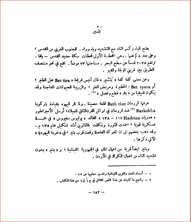 بتير قرية من قرى قبيلة بني حسن، تقع على بُعد ثمانية كيلومترات إلى الجنوب الغربي من القدس التي كانت تتبع لها إدارياً قبل الاحتلال الصهيوني للمدينة المقدسة وقطع الاتصال البري بين القرية والمدينة، فتبعت القرية لمدينة بيت لحم التي لا تبعد عنها أكثر من ثمانية كيلومترات. تقوم بتير في منتصف المسافة بين قريتي الولجة والقبو، وتجاورها أراضي بيت جالا وحوسان والخضر. التسمية: توجد عدة تفسيرات لتسمية بتير بهذا الاسم، فقد أرجع بعض المؤرخين اسمها إلى أصل كنعاني هو بيت - إير وتعني بيت الطير، والمقصود بالطير هنا طائر النسر الذي كان يُعشعش في أوكار جبالها العالية، ومن أجل ذلك سُمي الوادي الذي يجري بجوارها باسم وادي النسور، وهو وادي الصرار الحالي، أو أن اسمها مأخوذًُ من كلمة كنعانية أيضاً هي "بت - تيرا"، وتعني حظيرة الغنم، لكثرة تجمع الأغنام في سهل صغير يقع عند قدم القرية يسمونه القاعة (القاع) أو قد يكون ذلك الاسم مشتق من الفعل "بتر" العربي السامي، ويعني قطع أو فصل. على كل الأحوال كانت بتّير في عهد الرومان قلعة حصينة، لذلك عرفوها باسم "بث ثير Bethther"، وقد أوقعوا على أحد روابيها هزيمة ساحقة بجماعات يهودية متمردة على الحكم الروماني القائم في إيليا (القدس)، حين لجأت إليها هذه الجماعات بقيادة القائد اليهودي باركوخبا عام 135م، ولم ينج منهم سوى إثنين تسللا من أحد الشعاب المجاورة. آثارها: في قرية بتير مواقع أثرية قديمة يمتد أصولها إلى عهد الكنعانيين العرب، مروراً بالدول التي تعاقب على حكم بيت المقدس كاليهود والأغريق والرومان ثم المسلمين، حيث تحوي أرضها بقايا أبنية وبرك وأقواس تحمل قنوات تنقل مياه الينابيع إلى برك تحفظها ليستفيد منها المزارعون في ري أراضيهم. كما توجد مغاور وأرضيات مرصوفة بالفسيفساء، بالاضافة إلى مقامات لقبور بعض الصحابة المجاهدين الذين رافقو الفتح الإسلامي لفلسطين، فمنهم من مات أو استشهد على أراضها ليحفظ ثراها أجسادهم الطاهرة، ومن هذه المقامات: الشيخ خطاب، وأبو زيد، والعمري، وكذلك قبوراً لشهداء حرب فلسطين 1948م من المصريين والعراقيين. وتحيط بالقرية عدة خرائب منها: خربة اليهود، خربة حمدان وخربة أبو شوشة. وفي عام 1950م اكتشف العالم الأثري سيجورون مستوطنة قديمة بالقرب من بلدة بتير سموها هيفوبيتار، تحوي آثاراً عربية كنعانية، عملت سلطات الاحتلال لتحويلها إلى مكان أثري يهودي. يصل القرية طريق معبد افتتح عام 1952م طوله ستة كيلو مترات، بالطريق الرئيس الذي يصل مدينة الخليل بالقدس الشريف مروراً ببيت لحم عبر بلدة الخضر ومخيم الدهيشة المجاور لبيت لحم أو مباشرة عبر مدينة بيت جالاً. ترتفع بتير عن سطح البحر اكثر من سبعمائة مترٍ، في حين تبلغ المساحة العمرانية للقرية أكثر من مئتي دونم، أما مساحة أراضيها الزراعية فتزيد عن ثمانية آلاف دونم، اغتصب اليهود 780 دونماً منها عام 1948م لتشكل مع قرية بيت صفافا نموذجاً فريدا للاحتلال يحاكي احتلال الحلفاء مدينة برلين في الحرب العالمية الثانية، حيث قُسمت القريتان إلى قسمين: قسم محتل تحت السيادة الإسرائيلية، وآخر بقي عربياً تحت الإدارة الأردنية، لذا لم يكن غربياً أن ترى حاجزاً معدتياً يفصل البيت الواحد إلى قسمين في أي من القريتين. نصت اتفاقية رودس التي وقعها الأردن كبقية الدول المجاورة لفلسطين عام 1949م مع الاحتلال الصهيوني على السماح لأهل بتير باستغلال أرضهم الزراعية المُحتلة، مع عدم السماح بدخول أي مُسلح إلى تلك الأرض. تعبرُ أراضي القرية سكة حديد تصل القدس باللد، التي يمكن الانتقال منها بعد ذلك إلى كثير من المناطق الفلسطينية عبر شبكة من السكك الحديدية التي نفذتها شركة فرنسية لصالح الحكومة العثمانية عام 1905م، لكنها لم تهنأ بها حين خرجت مهزومة مع دول المحور في الحرب العالمية الثانية، فضاعت منها فلسطين كما الخلافة العثمانية الإسلامية بعد ذلك، علي يد حناعة الاتحاد والترقي التركية بزعامة كمال أتاتورك. اكتسبت القرية شهرة بسبب كونها آخر محطة يتوقف في