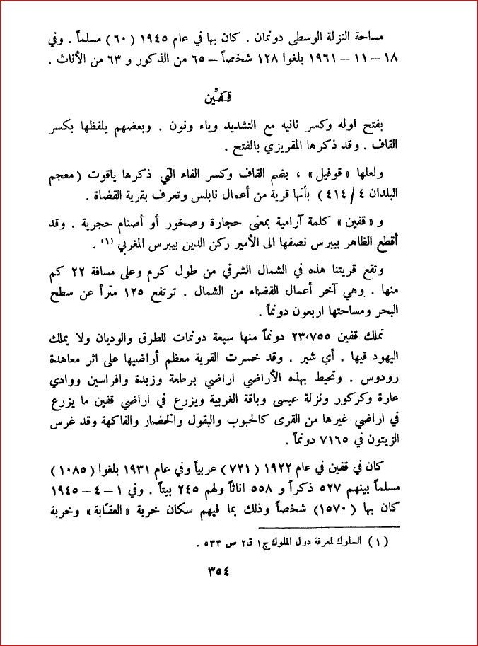 قفين بلدة من بلدات الضفة الغربية وتتبع محافظة طولكرم، ومن البلدات التي وقعت في حرب 1967. تعتبر بلدة قفين حسب المصادر التاريخية من أقدم البلدات بالمنطقة، حيث وجد آثار لقرى مندثرة ومقابر قديمة جدا مثل فراسين وشمسين وأبو الرجمان، ويرجع سبب تسمية قفين إلى كلمة آرامية تعني مدينة الصخور، وبها مقامات عديدة منها مقام الشيخ عثمان ومقام الشيخ مجاهد، وكانت قفين قديما معبرا رئيسيا للقوافل. تقع بلدة قفين شمال مدينة طولكرم بحوالي عشرين كم، وهي موقع متوسط في فلسطين بين السهل الساحلي غربا، والمرتفعات الشرقية والوسطى شرقا، على طريق القوافل التجارية القديمة بين سورية ومصر، وهذا الموقع ميز البلدة وجعلها قبلة أنظار الفاتحين وممر جيوشهم، البلدة محاطة بالجبال من جميع الاتجاهات ما عدا جهة الغرب حيث تطل على السهل الداخلي والساحلي لفلسطين، وتشتهر البلدة بأشجار الزيتون حيث أن نسبة 80% من أراضي البلدة مزروعة بأشجار الزيتون، وتمتاز البلدة بجودة زيتها. v عدد السكان :- بلغ عدد سكان البلدة عام 1922 إلى 800شخص، وفي عام 1931 إلى 1085 نسمة، وفي عام 1961 إلى 2457نسمة، وفي عـام 1997 حوالي 7000 نسمة، وحاليا يقدر بحوالي 12000نسمة، كما يقدر عدد اللاجئين في البلدة بحوالي 400 شخص. الوضع التعليمي والاجتماعي والصحي تحتوي البلدة ستة مدارس للذكور والإناث وهي ( اساسية للذكور, متوسطة للذكور, ثانوية للذكور, اساسية للأناث, متوسطة للأناث, ثانوية للأناث) ومجموع عدد الطلاب في المدارس 2500طالب وطالبة. الوضع الصحي في البلدة : يوجد عيادة صحية واحدة في البلدة تابعة لوزارة الصحة تقدم الخدمات للمواطنين للحالات العادية والطارئة تحول إلى مدينة طولكرم بمسافة 20كم. يتوفر في البلدة بئر ارتوازي للشرب، وتعتمد القرية اعتمادا كبيرا على محصول الزيتون والعمل داخل الخط الأخضر، ووجود ما يسمى بالجدار الأمني فقد فقدت القرية 80% من الأراضي الزراعية التي بقيت لها بعد عام 1948، وفي عام 1948 فقدت القرية 70% من أراضي البلدة داخل الخط الأخضر، والمصدر الثاني للرزق هو العمالة، وفي وجود الجدار الأمني والإغلاقات المستمرة فقد حرم العمال من الوصول إلى أعمالهم ،داخل الخط الأخضر. الثروة الحيوانية في البلدة حسب إحصاءات عام 2003 تقدر الثروة الحيوانية في البلدة بحوالي 3000رأس أغنام وأبقار، وقسم كبير من هذه الأغنام والأبقار كانت تعتمد بشكل كبير على المراعي، وبسبب وجود الجدار الأمني وضياع 80% من أراضي البلدة وفقدان المراعي، مما أدى إلى انخفاض كبير بعدد الأغنام والمواشي. الأضـرار تعتبر البلدة من أكثر البلدان المتضررة مما يسمى بالجدار الأمني، حيث تم مصادرة خمسة آلاف دونم خلف الجدار، بالإضافة إلى ستمائة دونم تم تجريفها وشق الجدار منها. النشاطات الاقتصـادية تعتمد البلدة اعتمادا كبيرا على الأرض، حيث أن حوالي 80% من أراضي البلدة مزروعة بأشجار الزيتون، حيث يعتبر الموسم الرئيسي بالبلدة، وتعد واردات البلدة من الزيتون بحوالي 3 ملايين دولار، وبسبب الجدار ومصادرة 70% من الأراضي وعدم مقدرة المزارعين من الوصول إلى أراضيهم بسبب الجدار فقد فقدت البلدة المورد الاقتصادي الرئيسي .و تعتمد البلدة كذلك على الأيدي العاملة، وبسبب الجدار والإغلاقات داخل الخط الأخضر فقد فقدت البلدة المورد الاقتصادي الثاني في البلدة، وبفقدان هذين الموردين فقد فقدت البلدة حوالي 85% من مواردها عدد المزارعين :-معظم أهالي البلدة من المزارعين الصغار ويقدر بحوالي 800 مزارع. عدد التجـار :-يبلغ عدد المحلات التجارية في البلدة حوالي مائة وعشرون محلا، معظمها بقالات صغيرة وخدمات أخرى صغيرة عدد العمــال :-تعتمد البلدة اعتمادا رئيسيا على العمالة حيث أن معظم أهالي البلـدة مهنيون وعمال ويقدر عددهم بحوالي أكثر من 2000 عامل عاطلين عن العمل، وتقدر بحوالي 80% من القوى العاملة. عدد المشتركين في خدمات الماء والكهرباء :-يبلغ عدد المشتركين في خدمات الماء والكهرباء 1200 مشترك. البنية التحتية شبكة مياه متكاملة مع حاووز. شبكة كهرباء قطرية. شبك