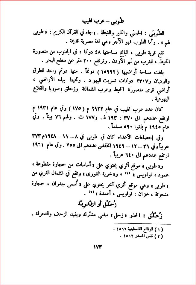 نبذة تاريخية عن سكان البلدة | معظم سكان هذه القرية من العرب البدو وتم تطهيرهم عرقيا ولكن بعضهم لايزال في القسم المغتصب يعيشون في قرية جوار قريتهم المدمرة تدعى بطوبى زنغرية ويالى العار قسم منهم يخدم في الجيش الصهيوني ضد إخوانهم الفلسطينيون. | ||||||||||||||||||
