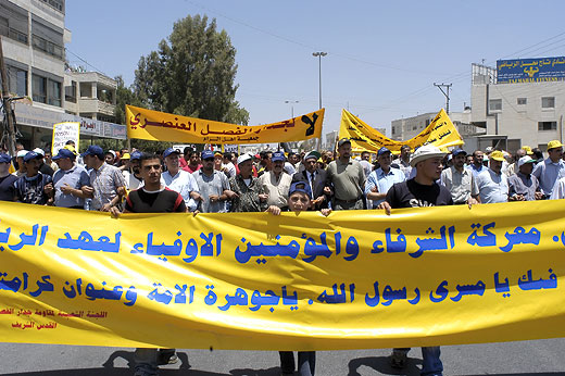 الرام: Demonstrators carry huge banners against the Apartheid Wall.