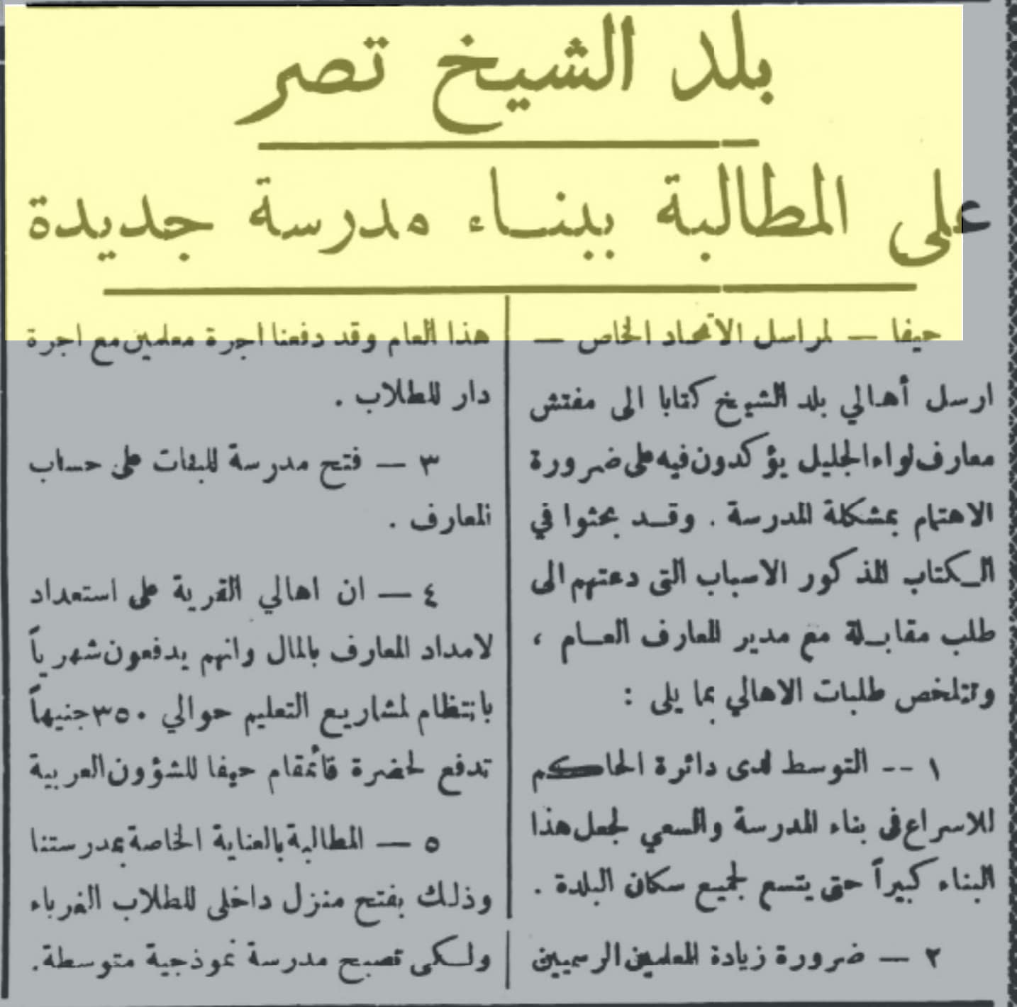 Schools | Balad al-Shaykh had an elementary school for boys which was founded by the Ottomans in 1887. | |||||||||||||||||||||