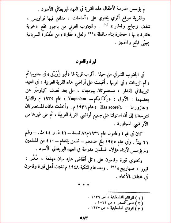 القرية قبل النكبة (كي لا ننسى للدكتور وليد الخالدي)كانت قيرة تقع على الطرف الغربي الصخري لوادي قيرة، وتشرف على مرج ابن عامر. وكان ثمة مجتمع أهلي وثيق الصلة بقيرة هو تل قامون، الذي يقع على بعد كيلومترين فقط إلى الشمال الشرقي. وقد دفعت هذه الصلة بعض سكان المنطقة إلى تسميتها ((قيرة وقامون)) عند الكلام عليهما. وكان نهر المقطّع، الذي يجري على بعد 4 كلم شمالاً، يشكّل الحدود الشمالية لأراضي قيرة. وقد جاءت قامون في المرتبة 113 على لائحة التي البلدات التي قام الفرعون المصري تحوتمس الثالث بغزوها في سنة 1468 ق.م. ومن المرجح أنه كان في موضعها موقع مدينة يقنعام الملكية الكنعانية التي سقطت في يد يشوع (يشوع 12:22)، ومدينة كيمونا (Cimona) الرومانية. وقد شيّد الصليبيون قلعة كيمون (Caymont) على التل الذي كانت قامون تنتصب عليه. صنفت قيرة (وقامون) مزرعة في ((معجم فلسطين الجغرافي المفهرس)) (Palestine Index Gazatteer) أيام الانتداب وكانت القرية مربعة الشكل، ومنازلها مبنية بالحجارة والطين أو بالحجارة والأسمنت. وكان البدو يضربون خيامهم في قيرة خلال شهور الإقامة الحضرية من ترحالهم الدوري. وكان سكانها من المسلمين، وكانت أنحاء عدة من أراضيها تحتوي على ينابيع. أما اقتصادها الزراعي فكان، في 1944/1945، يعتمد على الحبوب التي كانت تزرع في 261 دونماً. وكان سكانها يزرعون الخضروات أيضاً في قطع صغيرة من الأرض، ويحصّلون دخلاً إضافياً من تربية المواشي. وتظهر المعالم الأثرية المنتشرة على سطح الموقع أن قيرة وقامون أُنشئت على أنقاض موقع كان آهلاً في الماضي. وقد بيّن مسح أثري للمنطقة وجود تسعة موقعاً أثرياً، على الأقل، في البقعة الواقعة شرقي القرية، أهمها تل قيري وتل قامون، وتقوم الجامعة العبرية في القدس بالتنقيب في هذين الموقعين. إحتلال القرية وتطهيرها عرقياعزم الصندوق القومي اليهودي، في آذار/مارس 1948، على تهجير سكان قيرة وقامون باعتبارهم مزارعين يعملون بالأجرة في أراض يملكها اليهود. وقد بلّغ مسؤول رفيع المستوى في دائرة الأراضي التابعة للصندوق القومي، يدعى يوسف فايتس، ضابط استخبارات في الهاغاناه أن ((ينصح)) سكان القرية بالرحيل. فلما غادروها قرر فايتس وموظفون آخرون في الصندوق القومي أن يدمروا منازل سكانها ويتلفوا محاصيلهم ففعلوا ثم عرضوا عليهم تعويضاً في وقت لاحق. وذكر المؤرخ الإسرائيلي بِني موريس أن ذلك وقع في أواخر آذار/مارس، غير أنه لم يذكر شيئاً عن الوجهة التي اتخذها سكان القرية، ولا عن مصير أراضيها. القرية اليوميشاهَد ركام من منازل القرية متناثراً بين الشجيرات وأشجار الصنوبر التي غُرست في موقع القرية. وما زالت المياه تجري من أحد الينابيع في قناة منقورة في الصخر. وقد حُوّلت المنطقة المحيطة بالموقع إلى متنزّه. وينبت شجر اللوز والرمان والتين في الموقع، ويكسو شجر الصنوبر الروابي المحيطة به. أما باقي الأرض فيزرع حبوباً. المغتصبات الصهيونية على اراضي القريةفي سنة 1935، أُنشئت مستعمرة يوكنعام على ما كان تقليدياً من أراضي القرية. وفي سنة 1945، كان سكان المستعمرة قد امتلكوا أراضي القرية كلها. في سنة 1950، أُنشئت ضاحية يوكنعام عِليت امتداداً للمستعمرة. وأُنشئ كيبوتس تسرعا في سنة 1936 على الأراضي الممتدة بين تخوم قيرة وقامون وتخوم قرية أبو زريق. |