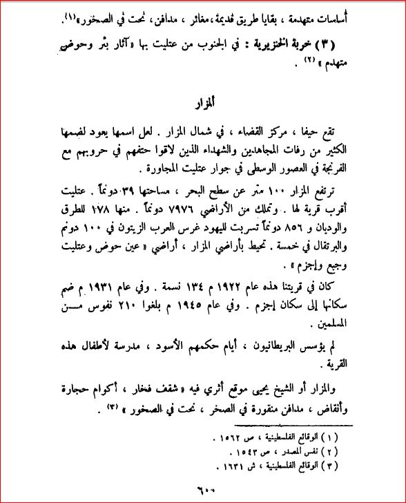 القرية قبل النكبة (كي لا ننسى للدكتور وليد الخالدي)كانت القرة مبنية على المنحدرات الغربية السفلى لجبل الكرمل، وتشرف على السهل الساحلي الضيق، وعلى البحر الأبيض المتوسط. وكان ثلث أراضي القرية يقع في جبل الكرمل، والباقي في السهل الساحلي. وكان الطريق العام الساحلي يمرّ بمحاذاة طرفها الغربي، في حين كانت قلعة الصليبيين في عتليت تقع على بعد كيلومترين ونصف كيلومتر فحسب إلى الشمال من القرية. وقد سمّيت القرية بهذا الاسم، في أرجح الظن، تكريماً للأشخاص الكثيرين الذين قتلوا ودفنوا هناك في أثناء محاربة الصليبيين. وكان شكل القرية أشبه بالمربع. كما كان سكانها، وهم من المسلمين، يتزودون مياه الاستخدام المنزلي من نبع يقع جنوبي شرقي القرية. كان اقتصاد المزار يعتمد على الزارعة وتربية المواشي. وكانت الحبوب المحاصيل الرئيسية، لكن الخضروات وأشجار الفاكهة كانت تُزرع فيها أيضاً. في 1944/1945، كان ما مجموعه 5 من الدونمات مخصصاً للحمضيات والموز، و3750 دونماً للحبوب، و473 دونماً مروياً أو مستخدماً للبساتين؛ منها 100 دونم مغروسة بأشجار الزيتون وقد احتوى الموقع على مصنوعات أثرية، كبعض الشظايا الفخارية والقبور المنقورة في الصخر، والحجارة المنحوتة. إحتلال القرية وتطهيرها عرقياكانت المزار ؟الطيرة وعين حوض- في أرجح الظن واحدة من القرى القليلة الواقعة جنوبي حيفا، التي أفلتت من الاحتلال ستة أسابيع تقريباً، بعد سقوط المدينة في أواخر نيسان/أبريل 1948. ويذهب المؤرخ الإسرائيلي بني موريس إلى أنها احتُلّت في منتصف تموز/يوليو، مع القرى الأخرى الواقعة في الجوار القريب. وقد حدث ذلك في أثناء عملية برية-بحرية مشتركة شُنّت خلال ((الأيام العشرة)) الفاصلة بين هدنتي الحرب. ومن الجائز أن يكون سكانها طُردوا على غرار ما حدث لسكان الطيرة. غير أن هذه العملية أخفقت في احتلال قرى المنطقة كلها؛ فـ((المثلّث الصغير))، المؤلف من قرى إجزم وجبع وعين غزال، والواقع جنوبي المزار تماماً، صمد أياماً قليلة أُخرى قبل أن يسقط تحت وطأة هجوم إسرائيلي مكثّف شكل بتنفيذه خرقاً للهدنة الثانية. ولذلك جاز أن تكون المزار قاومت، بدورها، الهجمات الإسرائيلية حتى أواخر تموز/يوليو. القرية اليوميتبعثر ركام من أنقاض المنازل الحجرية في أرجاء الموقع، الذي تكسوه الأعشاب البرية والأشواك ونبات الصبّار وأشجار التين والرمّان والتوت. والموقع مرسوم أيضاً بأجزاء الحيطان الحجرية المنتصبة، وبحطام المسجد الذي ظل قائماً حتى سنة 1983. المغتصبات الصهيونية على اراضي القريةفي سنة 1947، أُنشئت مستعمرة عين كرميل على بعد كيلومتر إلى الغرب من القرية. ويقع بعض أبنيتها الآن في أراضي القرية. |