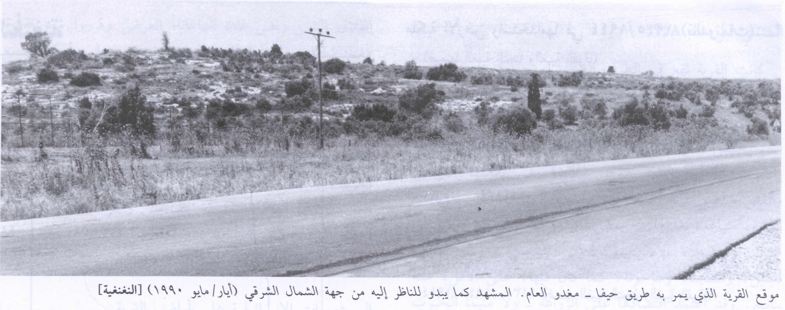 Village Before NakbaThe village was the smallest of a group of three villages (known collectively as al-Ghubayyat) that were located on the eastern slopes of the bilad al-rawha' (see Daliyat al-Rawha', Haifa District) the other two villages were al-Ghubayya al-Fawqa and al-Ghubayya al-Tahta. It lay on the northern edge of a hill at the edge of a wadi bed, and overlooked the plain of Marj ibn Amir and the Nazareth hills to the north and northeast. It was adjacent to the Haifa-Jenin highway.Al-Naghnaghiyya's population was Muslim. The village houses, scattered over the slopes, were made of stone and mud, stone and cement, or concrete. The three villages shared an elementary school that was built around 1888, during Ottoman rule; it was closed during the Mandate. They had access to a number of water sources including wadis, springs, and the al-Muqatta' River. Their economies were based on agriculture and animal husbandry, grain being the chief crop. A small area to the north of al-Naghnaghiyya was planted with fruit trees. In 1944/45 a total of 10,883 dunums of the lands of the three villages was allotted to cereals 209 dunums were irrigated or used for orchards. Next to al-Naghnaghiyya lay an artificial mound that bore the same name. Two km southeast, on the highway to Jenin, lay Tall al-Mutasallim, identified with Megiddo. Village Occupation and Ethnic CleaningThe village was reported occupied in a New York Times dispatch on 9 April 1948, when units of the Haganah broke a two-day truce in the battle for the settlement of Mishmar ha-Emeq. But Israeli historian Benny Morris states that al-Naghnaghiyya was not occupied until the night of 12-13 April. Like all villages captured in this operation, it was completely destroyed over the following days. It is not certain what happened to the residents they either fled during the attack or were expelled upon occupation, as occurred at nearby villages.Zionists Colonies on Village LandsThere are no Israeli settlements on village lands. Mishmar ha-Emeq, built in 1926, and Midrakh Oz, built in 1952, are the closest settlements.Village TodayThe remains of houses are scattered on the slope of one hill. The site, traversed by the Haifa-Megiddo highway and partly occupied by an Israeli soccer field, is difficult to identify.SourceDr. Walid al-Khalidi, 1992: All That Remains. |