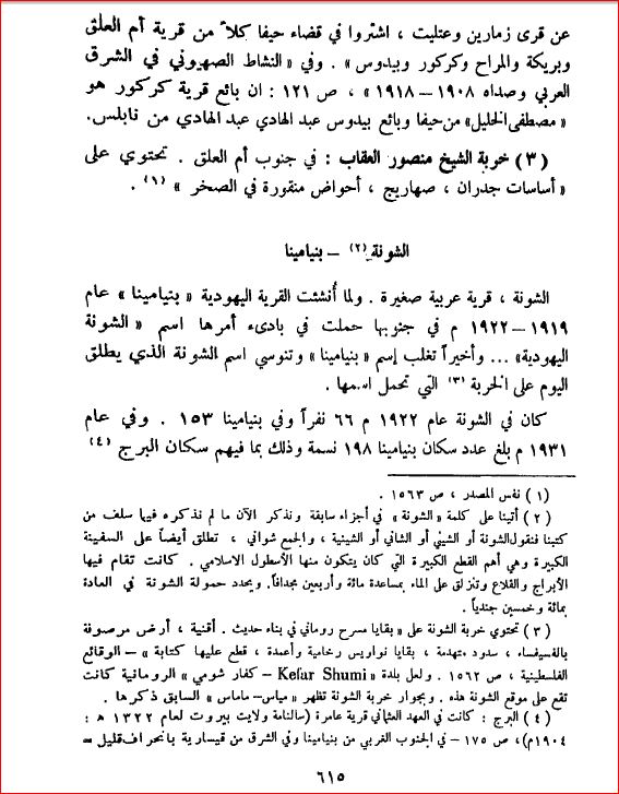 القرية قبل النكبة (كي لا ننسى للدكتور وليد الخالدي)كانت خربة الشونة تقع عند السفح الجنوبي الغربي لجبل الكرمل، قريباً جداً من الطريق العام الساحلي. وكانت سكة حديد حيفا-تل أبيب تمر عبر الطرف الغربي للقرية. وكان اسمها الأصلي الشونة. في أواسط العشرينات، دُمجت القرية والتي كانت تُعرف في بادئ الأمر بـ ((الشونة اليهودية)). ثم عُرفت القرية الفلسطينية بعد ذلك بخربة الشونة. وقد صُنّفت القرية مزرعةً في ((معجم فلسطين الجغرافي المفهرس)) (Palestine Index Gazetteer). وكان تل مبارك وهو موقع أثري أجرت الجامعة العبرية تنقيبات فيه خلال السنوات 1973-1976، يقع غربي القرية. ويعود تاريخ الطبقات الأربع عشرة للبقايا الأثرية، التي وُجدت، إلى أوائل الألف الثاني قبل الميلاد، وتمضي حتى العهود الرومانية والبيزنطية والصليبية، أي حتى القرن الثالث عشر بعد الميلاد. وكان في قمة هذا التل مقبرة تابعة لقرية جسر الزرقا الفلسطينية المجاورة [Stern 1978,1984]. إحتلال القرية وتطهيرها عرقياكانت القرية، الواقعة على الامتداد الساحلي الذي اعتبره القادة الصهيونيون قلب الدولة اليهودية المستقبلية، عرضة لعمليات ((التطهير)) التي نُفّذت في الأسابيع الأولى من الحرب. ففي أواسط آذار/مارس، وخلال نيسان /أبريل والنصف الأول من أيار/مايو 1948، نظمت قوات الهاغاناه والإرغون سلسلة من الغارات التي هدفت إلى طرد جميع السكان الفلسطينيين من المنطقة الساحلية الممتدة بين تل أبيب ومستعمرة زخرون يعقوف، جنوبي حيفا. واستناداً إلى المؤرخ الإسرائيلي بِني موريس، فإن قيادة الهاغاناه كانت تعتبر هذه المنطقة ((قلب الدولة اليهودية الناشئة)). وكانت الغارات تستهدف عادة قرية أو قريتين في الوقت نفسه، وتنجح غالباً في التسبب بذعر سكان القرى المجاورة وحملهم على الفرار. اختيرت العباسية (قضاء يافا) لتكون أول قرية تحتلها عصابة الإرغون في أثناء تنفيذ خطة الهاغاناه العامة هذه. وقد سقطت القرية في 4 أيار/مايو، وسيطرت قوات الإرغون عليها لمدة خمسة أسابيع كاملة، استناداً إلى ((تاريخ الهاغاناه)). فأنجزت الهاغاناه، في أواسط أيار/مايو، هدفها ((تطهير)) هذا القسم من السهل الساحلي من معظم سكانه العرب. القرية اليومسُيّج الموقع، وحدّثت المنازل القليلة الباقية وحوّلت إلى مرافق سياحية. وينمو حول هذه المنازل بعض أشجار الكينا الباسقة والنخيل ونبات الصبّار. المغتصبات الصهيونية على اراضي القريةلا مستعمرات إسرائيلية على أراضي القرية. لكن مستعمرة بنيامينا، إلى أُنشئت في سنة 1922 جنوبي الموقع، تمدّدت بحيث بات بعض أبنيتها قريباً جداً من التخوم الأصلية لأراضي القرية. وكانت قد دُمجت في مستعمرة نحالات جابوتنسكي (التي سميت بهذا الاسم تيمناً بفلاديمير جابوتنسكي، مؤسس الصهيونية التصحيحية) في سنة 1946. |