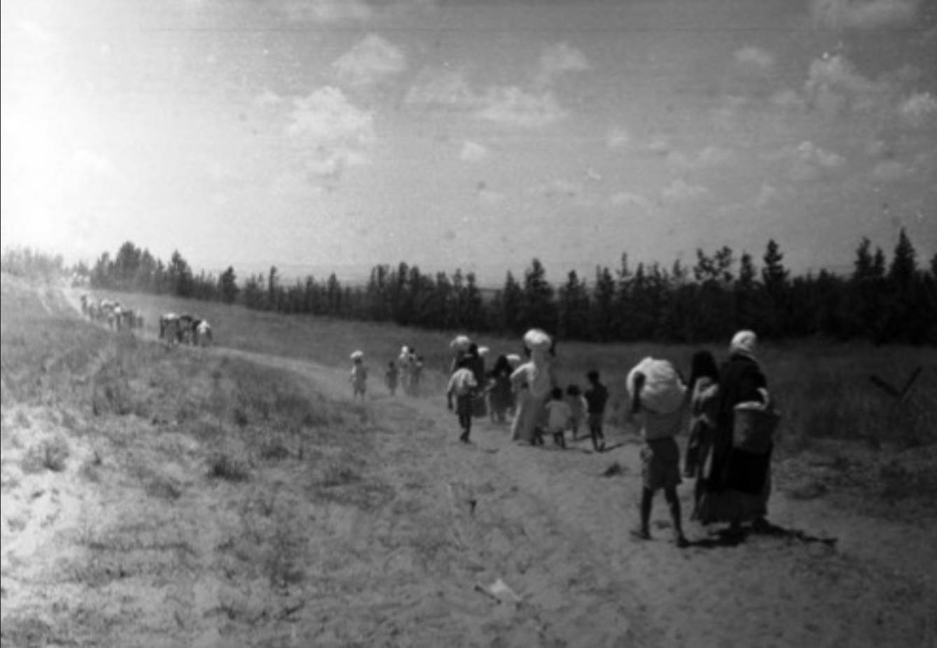 Towards noon we were led on foot to an orchard to the east of the village and I saw a bodies piled on a cart pulled by men of Tantura, who emptied their cargo in a big pit. Then trucks arrived and women and children were loaded onto them and driven to Fraydiss. On the road, near the railroad tracks, other bodies were scattered about.