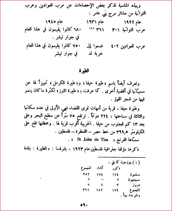 القرية قبل النكبة (كي لا ننسى للدكتور وليد الخالدي)كانت القرية تنتشر على المنحدرات الغربية السفلى لجبل الكرمل, مشرفة على السهل الساحلي, وكانت طريق فرعية تصلها بالطريق العام الساحلي, الى الشمال الغربي منها, وكانت الطيرة من أهم قرى قضاء حيفا, فهي أكثرها سكانا, وثانية كبرى القرى في القضاء ( بعد إجزم) من حيث المساحة. وقد أطلق الصليبيون عليها اسم سان يوهان دو تير. في سنة 1596 كانت الطيرة قرية ناحية شفا ( لواء اللجون), وعدد سكانها 286 نسمة, يؤدون الضرائب على عدد من الإنتاج والمستغلات كالماعز وخلايا النحل وكروم العنب. في أواخر القرن التاسع عشر, كانت الطيرة قرية ذات منازل مبنية بالحجارة والطين وكانت تقع على سفح جبل تتميز تلاله القريبة من القرية بكهوف, وتحيط بها بساتين الزيتون. وكان عدد سكانها 1200 نسمة تقريبا, وكانوا يزرعون 60 فدانا ( الفدان= 100-250 دونما). وقد أخذ اقتصاد القرية يتدهور بعد سنة 1872, في إثر التجنيد الإجباري الثقيل الوطأة الذي فرضه العثمانيون. لكن القرية عادت فازدهرت لاحقا. وقد بنى سكانها( 5240 مسلما و 30 مسيحيا, في أواسط الأربعينات) منازلهم الحجرية كالعناقيد. وكان شكل القرية مصلبا, وفيها مدرستان ابتدائيتان: أحداهما للبنين, والأخرى للبنات. وقد اشتملت أراضيها على بضعة ينابيع, واعتمد اقتصادها على الحبوب والخضروات والفاكهة. في سنة 1943, فاق إنتاج الطيرة من الزيتون والزيت ما أنتجته أية قرية أخرى في قضاء حيفا, وكان فيها ثلاث معاصر زيتون آلية. وقد غرس فيها أيضا الكثير من شجر اللوز, وهذا ما أدى الى تلقبها بطيرة اللوز. في 1944\1945, كان ما مجموعه 16219 دونما مخصصا للحبوب, و 3543 دونما مرويا أو مستخدما للبساتين. كما اشتغل بعض سكانها بتربية الدواجن. وكان في أراضي الطيرة خمس خرب, إحداها, وهي خربة الدير( 147245), تضم بقايا دير سان بروكادوس. وبعض الكهوف التي كانت آهلة سابقا, ونفقا من الحجارة المعقودة. وكان إلى الجنوب من القرية موقع أثري مكشوف يعود تاريخه الى العصر الحجري الوسيط, وقد نقب لاحقا. إحتلال القرية وتطهيرها عرقيافي 12 كانون الأول\ ديسمبر 1947, أغارت عصابة الإرغون بالقنابل على الطيرة, في أثناء الجولة الأولى من القتال. وقد تم ذلك في عيد الحانوكاه عند اليهود, واقترن بست هجمات إرهابية أخرى شنتها العصابة نفسها في أماكن عدة من فلسطين. ويذكر (( تاريخ الهاغاناه)) أن الغارة أدت إلى مقتل 13 شخصا في الطيرة, وكشفت صحيفة(( فلسطين)) عن وجود أطفال وشيوخ في جملة الضحايا. وجاء تقريبا, وأنها اقتربت من منزل منفرد في طرف القرية وقذفته بالقنابل. ثم إن المهاجمين أطلقوا نيرانهم على المنازل قبل أن ينسلوا عائدين عبر بساتين الزيتون, الى حيث كانت شاحنة في انتظارهم. وذكرت صحيفة(( نيويورك تايمز)), توكيدا للهجوم, وقوع عشرة جرحى فضلا عن مقتل ثلاثة عشر شخصا وتدمير منزل واحد وإصابة عدة منازل أخرى بأضرار. وخلال الأسابيع اللاحقة, تعرضت القرية لهجمات أصغر ففي 5 شباط\ فبراير 1948, شن هجوم استمر ساعة وثلاثين دقيقة, ولم يسفر عن وقوع ضحايا, استنادا إلى بلاغ رسمي بريطاني جاء فيه أنه لم يصدر عن القرية أية ردة فعل . وفي الصباح الباكر من 22 نيسان \ أبريل, شن هجوم كبير على الطيرة, ترافق مع هجوم الهاغاناه على حيفا. وكان هدف الهجوم, في الظاهر منع التعزيزات العربية من الوصول الى حيفا. لكن المحاولة الأولى للاستيلاء على القرية تمت بعد أيام قليلة من سقوط حيفا. ويذكر المؤرخ الإسرائيلي بني موريس أن الهجوم وقع في الساعة الواحدة والدقيقة الأربعين من صباح 25 نيسان\ أبريل, وأن مدافع الهاون والرشاشات استخدمت فيه. لكن سرعان ما حضرت وحدة بريطانية الى مكان الاشتباك, وتوقف إطلاق النار. وفي زعم موريس أن البريطانيين ساعدوا في إجلاء بعض النساء والأطفال, وفي إيصالهم الى مأمنهم. وهو يضيف أن الهجوم استؤنف صباح اليوم التالي بعد أن غادر البريطانيون, واستمر الى أن وصلت وحدة بريطانية أخرى في وقت لاحق من النهار, ونظمت عملية إجلاء أخرى. وجاء في صحيفة (( نيورك تايمز)) أن القرية (( قصفت قصفا شديد
