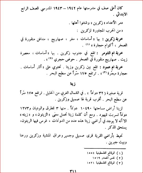 القرية قبل النكبة (كي لا ننسى للدكتور وليد الخالدي)كانت القرية تقوم على تل يبعد كيلومتراً إلى الشمال من وادي زيتا. وكانت درب ترابية تصلها بعراق المنشية، الوقعة على الطريق العام الممتد من الشرق إلى الغرب، بين مدينة المجدل الساحلية وبيت جبرين. وكانت زيتا القديمة (خربة زيتا الخراب) تقع على بعد كيلومتر ونصف كيلومتر إلى الجنوب من القرية، على الضفة الجنوبية للوادي (وقد نُقل السكان إلى الموقع الجديد في زمن الانتداب، لأن مياه الوادي الآسنة كانت تولد الحشرات والأمراض). في سنة 1596، كانت زيتا قرية في ناحية غزة (لواء غزة)، وعدد سكانها 165 نسمة. وكانوا يؤدون الضرائب على القمح والشعير والماعز وخلايا النحل. في أواخر القرة التاسع عشر، وُصفت زيتا بأنها مزرعة صغيرة مبنية بالطوب، على طرف الوادي، وتحيط بها من جانبيها تلال منخفضة. كانت قرية زيتا الجديدة تمتد على محور شمالي شرقي- جنوبي غربي، وكانت منازلها مبنية بالطين والخشب والقصب. وكان سكانها من المسلمين، ويستمدون مياه الشرب من آبار إرتوازية حُفر معظمها جنوبي القرية قرب وادي زيتا، حيث كانت المياه الجوفية قربة من سطح الأرض وكان ثمة بئر أخرى شمالي زيتا. كما كان سكانها يشتغلون بالزراعة البعلية وتربية المواشي، ولا سيما الغنم والماعز. وكانوا يزرعون الحبوب في مساحات واسعة، ويستعملون الأراضي الباقية مرعى لمواشيهم. في 1944/1945، كان ما مجموعه 3027 دونماً مخصصاً للحبوب. إحتلال القرية وتطهيرها عرقياكانت زيتا إحدى القرى التي احتلّت في أثناء عملية أن- فار. ويذهب المؤرخ الإسرائيلي بِني موريس إلى أن زيتا احتلت عند نهاية هذا الهجوم، في 17-18 تموز/يوليو 1948. غير أن "تاريخ حرب الاستقلال" يذكر أن الاحتلال وقع في 9-10 تموز/يوليو، أي قبل أسبوع تقريباً. القرية اليومما من أثر لمنازل القرية، ولم يبق منها إلاّ بئر ما زالت تُستعمل. وتغطي الأعشاب الطويلة والأزهار البرية والأشجار جزءاً من الموقع، بينما يزرع الفلاحون الإسرائيليون الأراضي المحيطة. المغتصبات الصهيونية على اراضي القريةلا مستعمرات إسرائيلية على أراضي القرية. فبعد شهر تقريباً من احتلال القرية، قدم الصندوق القومي اليهودي على الحكومة الإسرائيلية مخطط استيطان يتضمن إنشاء كيبوتس في موقع القرية. وقد سمّى المخطط، وهو مؤرّخ في 20 آب/أغسطس، هذه المستعمرة كيبوتس غلؤون؛ وهذا استناداً إلى موريس. غير أن مصادر أُخرى تشير إلى أن كيبوتس غلؤون كان أُقيم سابقاً على أراض كانت تابعة تقليدياً لقرية عنا، وإلى أنه أنشئ في أوائل سنة 1947 على بعد 2 كلم فقط من موقع القرية. |