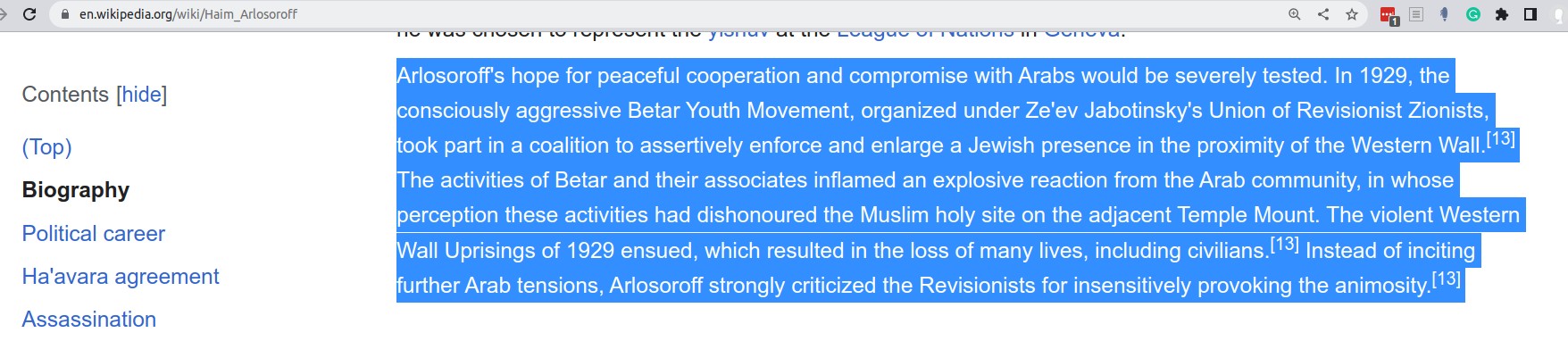 When I went to see how this riot was covered at the time, I found the official story was develped much later on. Haim Arlosoroff actually tried to water down before he died. He did a peace offering with the Palestinians arabs. Tell me when the current narritive developed, if you can.