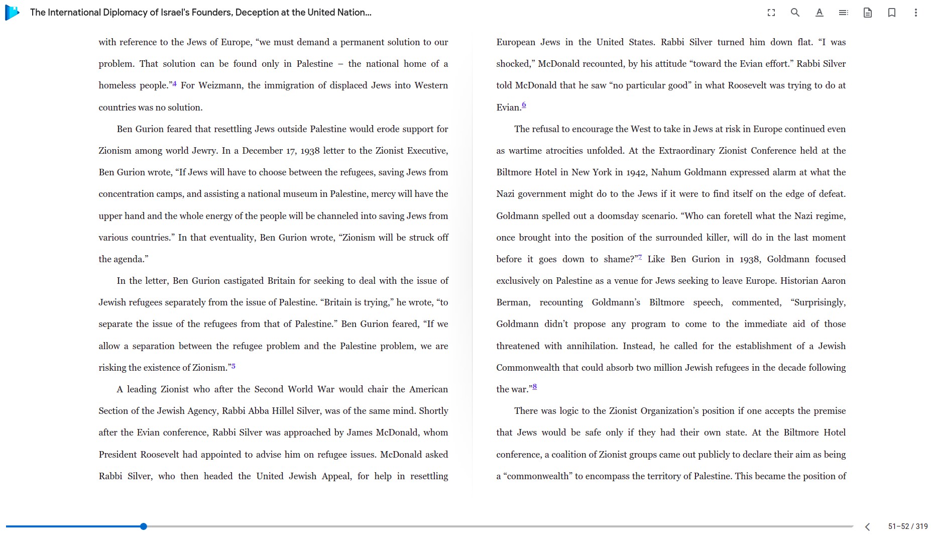 "Britain is trying," he wrote, "to separate the issue of the refugees from that of Palestine." Ben-Gurion feared, "If we allow a separation between the refugee problem and the Palestine problem, we are risking the existence of Zionism." (The International Diplomacy of Israel's Founders by John Quigley, p. 51-52 and The Other Israel by Arie Bober, p. 171;