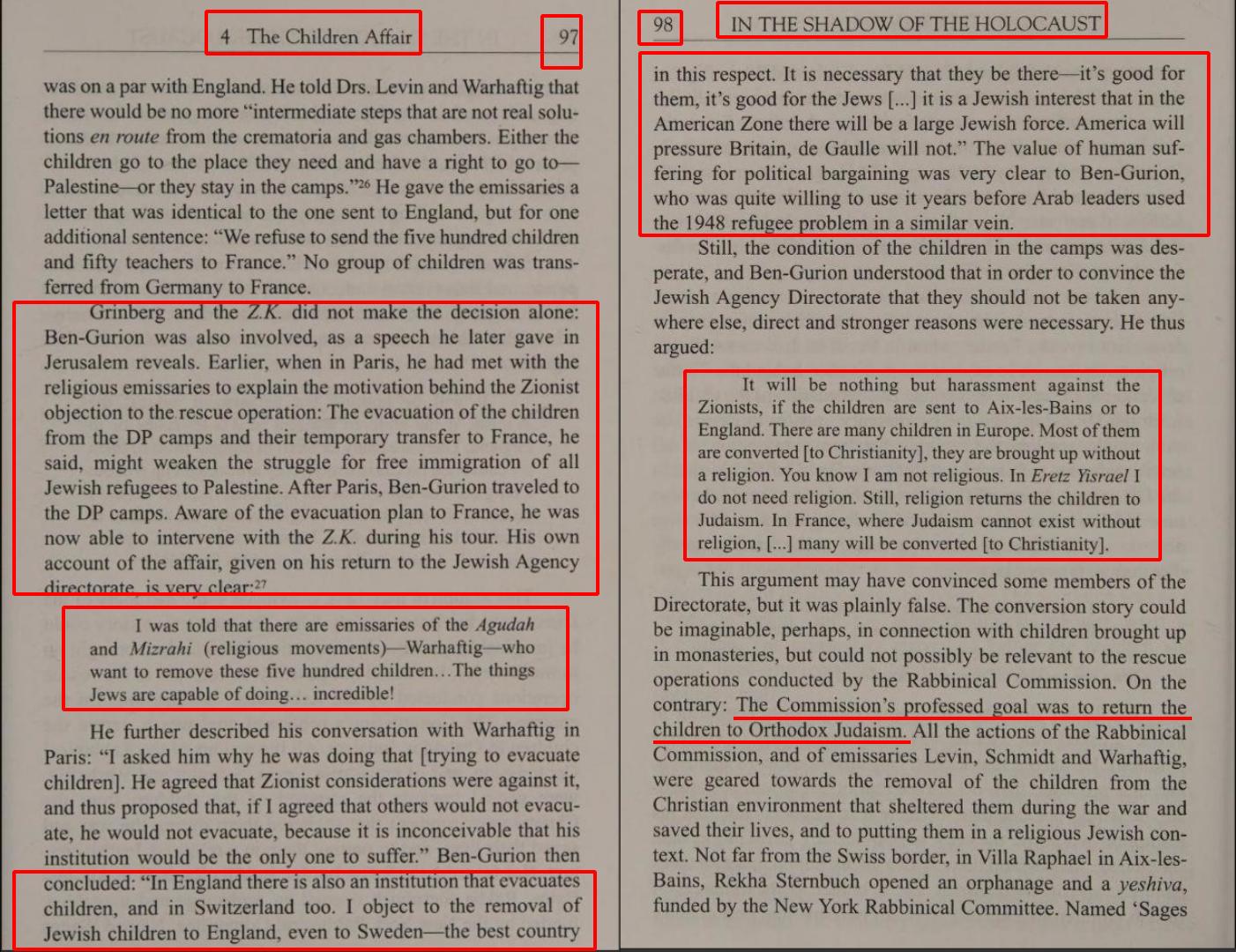 Just in case you think that Ben-Gurion was remorseful during WWII and he softened his heart of stone, well, think twice. The head of yishuv's so-called Rescue Committee (Yizhak Gruenbaum, who was well known for his antisemitic remarks during the war) dared to suggest saving Polish Jewish kids by shipping them to South Africa (instead of Palestine) in the summer of 1943, and as usual, Ben-Gurion quickly shut it down; it was dead in the water. See Dina Porat, p. 138, and pay attention to Dina's Hasbarah at the top of page 139. Her Hasbarah always starts with a "perhaps!"