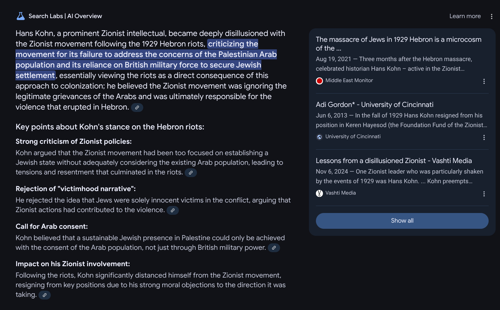 We decided to ask Google's Gemini:It was stunning to read your description of how liberal journalists have inverted morality on its head! I didn't want to discuss the Hebron Riots of 1929 with you yet. But I guess now is the time?