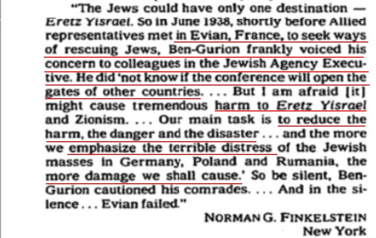 ''The Jews could have only one destination - Eretz Yisrael. So in June 1938, shortly before Allied representatives met in Evian, France, to seek ways of rescuing Jews, Ben-Gurion frankly voiced his concern to colleagues in the Jewish Agency Executive. He did 'not know if the conference will open the gates of other countries. . . . But I am afraid [ it ] might cause tremendous harm to Eretz Yisrael and Zionism. . . . Our main task is to reduce the harm, the danger and the disaster . . . and the more we emphasize the terrible distress of the Jewish masses in Germany, Poland and Rumania, the more damage we shall cause .' So be silent, Ben-Gurion cautioned his comrades. . . . And in the silence . . . Evian failed.'' NORMAN G. FINKELSTEIN New York