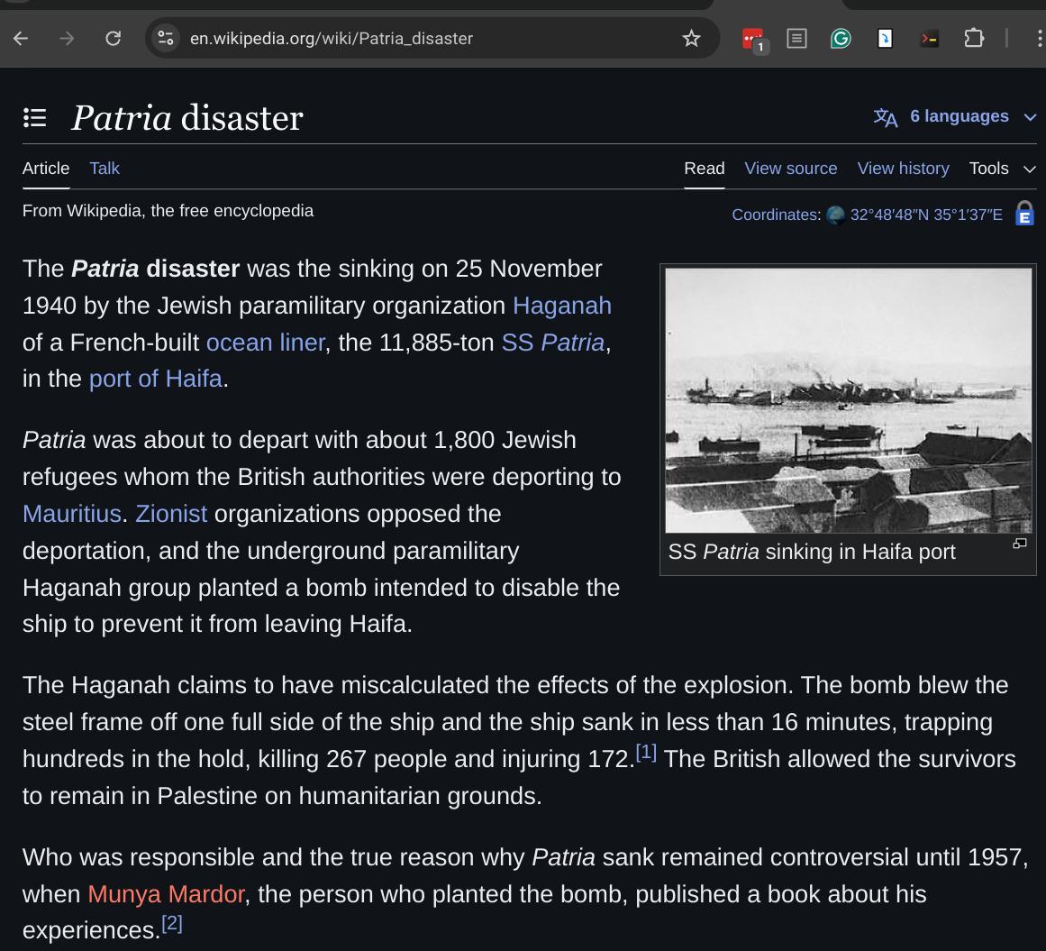 [Two important points to keep in mind: A) When Ben-Gurion said this statement, he knew that Patria was sunk by the Haganah based on Moshe Sharett's orders in November 1940 (almost 16 months earlier ). That by itself was very telling. B) The mass majority of Europe's Jewry after WWII ended immigrated to the Americas and preferred to live with the Gentiles even after Palestine was emptied of its people.]