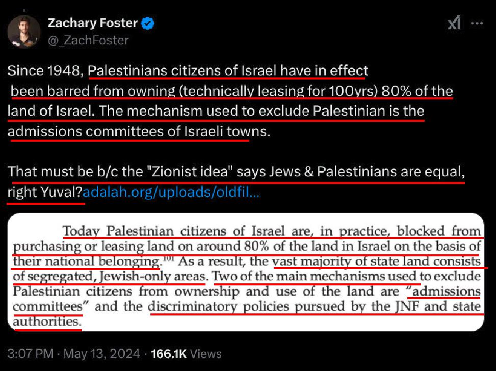 Here is Zachary Foster makes our point with very simple language; he was replying to Yuval Harari's claim that Israeli-Palestinians are treated equally as Israeli Jews: