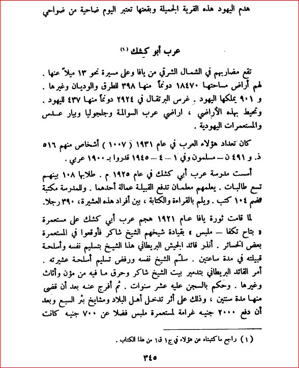 القرية قبل النكبة (كي لا ننسى للدكتور وليد الخالدي)كانت القرية تقع في رقعة مستوية في السهل الساحلي الأوسط, وعلى بعد نحو كيلومترين الى الشمال الغربي من نهر العوجا. وكانت طريق فرعية تصلها بطريق يافا- حيفا العام, كما كان هناك طرق فرعية أخرى تصلها بالقرى المجاورة. استخدم الموقع أولا عرب أبو كشك من البدو إذ كانوا يضربون خيامهم الموسمية فيه, ثم تطور فأصبح قرية. كانت منازل أبو كشك, التي لم يتخذ شكل انتشارها نمطا مخصوصا, تتكتل في مجموعات صغيرة وكان سكانها في معظمهم من المسلمين. في سنة 1925 أسست مدرسة في القرية, وبلغ عدد التلامذة الذين يؤمونها 108 من التلامذة في أواسط الأربعينات بينهم 9 تلميذات. وكان في القرية أيضا بضعة متاجر صغيرة. وكان مقام شيخ يدعى سعد يقع الى الشمال منها, في الحقول الممتدة بينها وبين قرية السوالمة المجاورة. في 1944\1945, كان ما مجموعه 2487 دونما من أراضيها مخصصا للحمضيات والموز, و 14018 دونما للحبوب و 226 دونما مرويا أو مستخدما للبساتين. وكانت الزراعة تعتمد في جزء منها على مياه الأمطار, وفي جزء آخر منها على مياه الأمطار, وفي جزء آخر على الري ( ولاسيما من الآبار الارتوازية) الذي كان غاية الأهمية للبساتين. وقد اعتنى سكان القرية بتربية المواشي, فضلا عن عنايتهم بالغلال الزراعية. إحتلال القرية وتطهيرها عرقياسقطت أبو كشك, على الأرجح, في يد الصهيونيين قبل مدة قصيرة من انتهاء الانتداب البريطاني على فلسطين في 15 أيار\ مايو 1948. ويذكر المؤرخ الفلسطيني عارف العارف أن القوات الصهيونية كانت, في تلك الآونة تسيطر على كامل المنطقة الساحلية الواقعة بين حيفا وتل أبيب. ومن الجائز أن تكون أبو كشك تأثرت بالحوادث التي جرت في قرية الشيخ مونس المجاورة, إذ كانت القريتان تقعان مباشرة خلف حدود تل أبيب, وكانتا هدفا للهجوم في أوائل الحرب. ويشير المؤرخ الإسرائيلي بني موريس الى أن(عملية إخلاء المنطقة الواقعة مباشرة الى الشمال من تل أبيب إخلاء نهائيا, قد تمت على يد عصابة الإرغون). ولم ينفع اتفاق هدنة, كان عقد سابقا بين سكان الشيخ مونس الهاغاناه, في ردع الإرغون عن الاعتداء على زعماء القرية. ذلك بأن مجموعة من هذه العصابة تسللت الى داخل القرية, في أواخر آذار\ مارس 1948, وخطفت خمسة من هؤلاء الزعماء. وحمل هذا الهجوم الناس على الفرار بكثرة من المنطقة الساحلية المحيطة بالقرية ( وقد يكون سكان أبو كشك ضمنهم). القرية اليوميحتل مجمع مسيج لصناعة الخردوات العسكرية الموقع ورقعة كبيرة محيطة به. وينبت الصبار وشجر اللوز قرب معبر بني فوق الطريق العام الذي يصل الى المجمع. وثمة خارج السياج, في الركن الجنوبي الشرقي من القرية, بقايا منزلين كان أحدهما مدرسة خاصة لأولاد قرية السوالمة المجاورة. المغتصبات الصهيونية على اراضي القريةأصبح موقع القرية اليوم ضمن ضواحي بلدة هيرتسليا ( 135174), الآخذة في التوسع. |