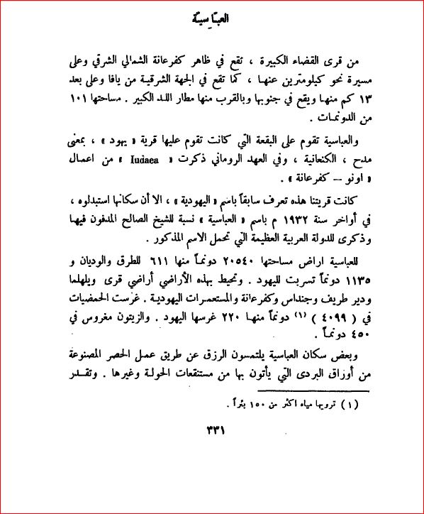 القرية قبل النكبة (كي لا ننسى للدكتور وليد الخالدي)كانت القرية قائمة على أرض مستوية في السهل الساحلي الأوسط, وكانت طرق عدة تصلها بيافا واللد والرملة. وكان خط سكة الحديد, الممتد بين يافا واللد يمر جنوبي القرية مباشرة, ويقع مطار اللد على بعد 4 كلم الى الجنوب منها. وقد كانت القرية تدعى يهود في العهد القديم, وكانت تحت سيطرة قبيلة دان. عرفت العباسية زمن الرومان باسم يوديا, ودعيت اليهودية في الحقبة ما بعد الرومانية. في سنة 1596, كانت العباسية قرية في ناحية الرملة (لواء غزة), وعدد سكانها 693 نسمة. وكانت تؤدي الضرائب على عدد من الغلال كالقمح والشعير والفاكهة والسمسم, بالإضافة الى عناصر أخرى من الإنتاج والمستغلات كالماعز وخلايا النحل. وذكر الرحالة الشامي المتصوف البكري الصديقي الذي جال في المنطقة في أواسط القرن الثامن عشر, أنه زار مقام النبي هودا هناك ومكث في القرية تلبية لدعوة صديق له [ مذكور في الخالدي 1968: 226]. في أواخر القرن الثامن عشر, كان عدد سكان القرية يتراوح بين 800 نسمة و 1000 نسمة وكانت مبنية بالطوب ومحاطة بشجر النخيل. وكان سكانها يتزودون المياه من بركة قريبة. في سنة 1932 أعاد سكانها تسميتها العباسية إكراما لذكرى شيخ يدعى العباس مدفون هناك, وإشارة الى الخلافة العباسية أيضا. وقد كان سكان القرية في ذلك الوقت من المسلمين باستثناء عشرين مسيحيا. وكان فيها مسجدان: أحداهما كبير له مئذنة يبلغ ارتفاعها 21 مترا ( وكان قائما وسط القرية أول الأمر), والثاني أصغر منه ويقع في الركن الشمالي الغربي من القرية. كان في العباسية مدرستان: أحداهما للبنين, والأخرى للبنات. وقد أنشئت مدرسة البنين في سنة 1919, وصارت مدرسة متوسطة في سنة 1941 وبلغ عدد المدرسين فيها 14 مدرسا, وعدد التلامذة 293 تلميذا في الوقت وهذا ما جعلها كبرى مدارس القرى القضاء. وقد ضمت غليها مساحة 27 دونما من الأرض للتدريب الزراعي. أما مدرسة البنات ففتحت أبوابها في سنة 1943, وكان عدد التلميذات المسجلات فيها 101 في أول الأمر. كما أنشأ سكان العباسية ناديا ثقافيا اجتماعيا, هو النادي العباسي, كان يعني بمكتبة وبفريق لكرة القدم. يضاف الى ذلك أن الحكومة عينت من سكان القرية أعضاء في المجلس البلدي الذي أسس في سنة 1945, وأوكلت إليه مهمة تحسين الخدمات الاجتماعية وتعبيد الطرق. كان سكان العباسية يكسبون رزقهم, في الأساس من الزراعة ومن جدل الحصر المصنوعة من سيقان نبات البردي المجلوبة من مستنقعات بحيرة الحولة. ثم بدأو في أثناء الحرب العالمية الثانية, يعنون بتربية البقر من نوع هولشتاين. في 1944\ 1945, كان ما مجموعه 3879 دونما مخصصا للحمضيات والموز, و 12348 دونما للحبوب و 1019 دونما مرويا أو مستخدما للبساتين. وكانت مياه الري تجلب من عدة آبار ارتوازية. وكان سكان القرى المجاورة يقصدون سوق السبت الأسبوعية في العباسية, حيث كانوا يشترون ويبيعون المنتوجات الزراعية والحيوانات والنسيج. إحتلال القرية وتطهيرها عرقيانفذت عصابة الإرغون هجوما على القرية في 13 كانون الأول\ ديسمبر 1947 ( يوم عيد الحانوكاه عند اليهود). وقد جاء في (تاريخ الهاغاناه) أن الإرغون, التي كانت تعمل بالتزامن مع عدة غارات متتالية على المدن والقرى الفلسطينية, تسللت الى القرية في أربع عربات وزرعت عبوات ناسفة قرب عدد من المنازل, ثم عادت أدراجها من حيث أتت. وقد أشارت صحيفة ( نيويورك تايمز) الى أن عدد القتلى بلغ سبعة, وأن سبعة أشخاص آخرين أصيبوا بجروح خطرة, توفي اثنان منهم لاحقا ( طفل في الخامسة من عمره, وامرأة في العشرين), كما أتي الى ذكر إصابة خمسة آخرين في الأيام التي تلت. كما جاء في التقرير أن المهاجمين وعددهم أربعة وعشرون كانوا متنكرين في زي جنود بريطانيين, مضيفا أنهم ( أطلقوا النار على اليهودية, وفجروا عددا من المنازل, ورموا منازل أخرى بالقنابل اليدوية). وكتب مراسل الصحيفة نفسها أيضا يقول إن ( مجموعة من المهاجمين أطلقت النار على بعض سكان القرية الجالسين أمام مقهى, بينما وضعت مجموعة أخرى منهم قنابل موقوتة قرب بضعة منازل, ورمت بعض ال
