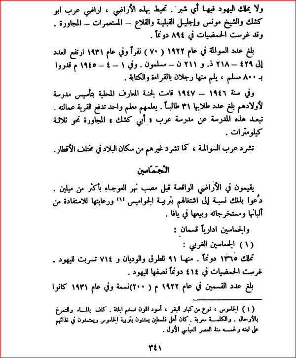 القرية قبل النكبة (كي لا ننسى للدكتور وليد الخالدي)كانت القرية تقع على بعد 5, 2 كلم من شاطئ البحر, في السهل الساحلي الأوسط, وتتاخمها المستنقعات ويعني القسم الأول من اسمها مربي الجواميس بينما يميزها القسم الثاني من توأمها الجماسين الشرقي. باعتبارها ( قبيلة) في ناحية بني صعب( لواء نابلس). وكان أفرادها يؤدون الضرائب على الجواميس. وليس من الثابت أن هذه (القبيلة) بنت فعلا, منذ ذلك التاريخ القريتين اللتين حملتا هذا الاسم, إذ إن موقعيهما لم يكونا يعدان من مواطن السكن الدائم في السجلات الضريبية. وقد عرف السكان بأنهم من أصل بدوي هاجروا من غور الأردن. في القرن الثامن عشر كان سكان الجماسين وكلهم من المسلمين قد استقروا في المنطقة. وكان المسكن المميز للقرية يدعى (( الخوص)) ( وهو كوخ مخروطي أو هرمي الشكل, مصنوع من جذوع الشجر وأغصانها [سرحان 1989: 154]), وإن كان بعض منازلها بني بالطوب. في سنة 1922 كان يعيش في القرية 200 نسمة تقريبا, وبحلول سنة 1944 ارتفع هذا العدد الى أكثر من 1000 نسمة. وكان أبناء القرية يؤمون مدرسة قرية الشيخ مونس. وكانت تربية الجواميس مورد الرزق الأساسي لسكان الجماسين إذا كانوا يبعون لحمها وحليبها في يافا, ويستخدمونها في جر العربات وسواها. وكانوا يعنون- فضلا عن تربية الحيوانات ؟ بزراعة الفاكهة, ولا سيما الحمضيات. في 1944\1945, كان ما مجموعه 202 من الدونمات مرويا أو مستخدما للبساتين. وكان نفر من سكان القرية يعمل أيضا في بساتين الحمضيات خارج القرية ولا سيما في البساتين التي يملكها الألمان في سارونا. إحتلال القرية وتطهيرها عرقيامن المرجح أن تكون الجماسين الغربي وقعت في قبضة القوات الصهيونية قبيل نهاية الانتداب البريطاني في 15 أيار\ مايو 1948, إذا كانت هذه القوات تسيطر في تلك الآونة على كامل المنطقة الساحلية بين حيفا وتل أبيب ( أنظر أبو كشك والمسعودية, قضاء يافا). القرية اليومالموقع مغطى بالأعشاب والحشائش البرية التي تتخللها, هنا وهناك أشجار السرو والتين وشوك المسيح ونبات الخروع. وقد بقيت منازل عدة آخذة في التلف: بعضها يقيم اليهود فيه, وبعضها الآخر مهجور. وأحد المنازل الآهلة بناء ذو طبقتين. يبدو أنه تكتل غرف متفاوتة الأشكال والحجوم, ولا علاقة للواحدة منها بالأخرى, وأبوابها ونوافذها مستطيلة الشكل. أما سقوف غرف الطبقة العلوية فماثلة على شكل الجملون. وأما طلاء الحيطان الخارجية فآخذة في التآكل. ويظهر في الأفق الخلفي مجمعات تل أبيب السكنية الشاهقة. المغتصبات الصهيونية على اراضي القريةلا مستعمرات إسرائيلية على أراضي القرية, لكن البناء في تل أبيب المجاورة امتد وطغى على الموقع الذي بات الآن جزءاً تابعا لبلدية تل أبيب. |
