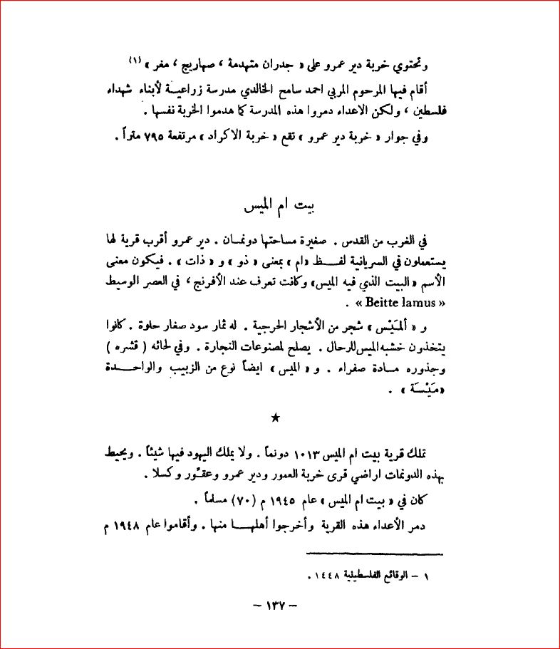 القرية قبل النكبة (كي لا ننسى للدكتور وليد الخالدي)كانت أم الميس تقع في منطقة جبلية مواجهة الشمال الغربي, وكان يحدها واديان عميقان في الشمال الشرقي والجنوب الغربي, يلتقيان شمالي غربي القرية. وقد أضفى هذا المزيج من المرتفعات الشاهقة والأودية السحيقة في ثلاث جهات, نوعا من الأهمية الاستراتيجية على القرية. وكانت طريق فرعية تربط بيت أم الميس بالطريق العام الممتد بين القدس ويافا, وبقريتي صوبا والقسطل. في عهد الصليبيين, عرفت القرية باسم ( بيتلاموس) وكانت مبينة على شكل شبه المنحرف, ومنازلها القديمة الحجرية المتراصة جنب إلى جنب. أما منازلها الأحدث عهدا فقد امتدت في اتجاه الجنوب الشرقي. نحو الجبل الذي يشرف على القرية من جهة الجنوب. وقد صنف (معجم فلسطين الجغرافي المفهرس) بيت أم الميس, في عهد الانتداب, مزرعة صغيرة. وكان سكانها من المسلمين, ويتزودون مياه الشرب من ينبوعين يقعان إلى الجنوب الغربي من القرية. وكان اقتصادها الزراعي يعتمد على استنبات الحبوب والفاكهة, ولا سيما العنب. وكان قسم من أراضي القرية يستخدم مراعي للخراف والماعز. وكانت الأراضي الزراعية تقع في معظمها جنوبي القرية, بينما تغطي الكروم والبساتين السفوح الجبلية في 1944\1945, كان ما مجموعه 273 دونما مخصصا للحبوب و51 دونما مرويا أو مستخدما للبساتين. وكانت خرب عدة تقع في جوار القرية. إحتلال القرية وتطهيرها عرقياعلى الرغم من أن ظروف احتلال هذه القرية غير معروفة, فإن شبه المؤكد أنها احتلت في سياق عملية ههار ( أنظر علار, قضاء القدس), وهي الهجوم عبر الجزء الجنوبي من ممر القدس عقب الهدنة الثانية. ويشير المؤرخ الإسرائيلي بني موريس إلى أن القرية سقطت يوم 21 تشرين الأول\ أكتوبر 1948 في قبضة لواء هرئيل على أرجح الظن. القرية اليوم