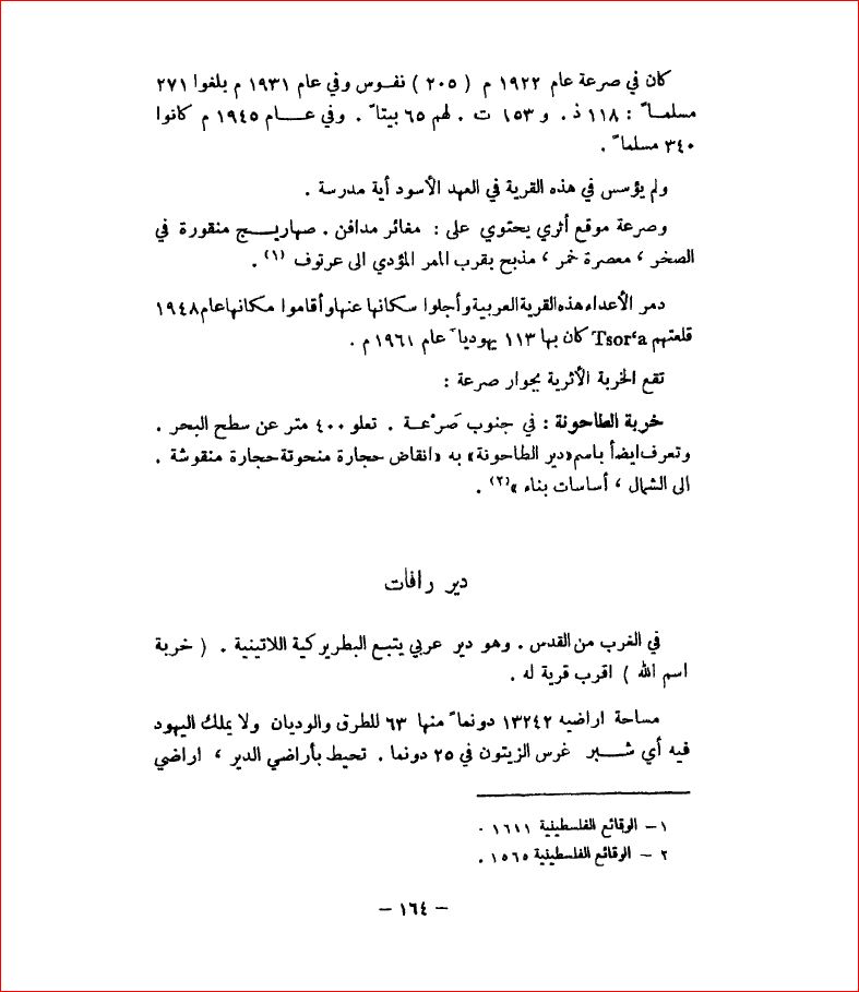 القرية قبل النكبة (كي لا ننسى للدكتور وليد الخالدي)كانت القرية تقع على السفح الغربي لجبل متوسط الارتفاع وكما يدل القسم الأول من اسمها (دير) فقد كانت القرية موقع دير كبير من ممتلكات البطريركية اللاتينية. وكانت القرية تضم مسجدا واحدا يعرف بمسجد الحاج حسن. وفي أواخر القرن التاسع عشر, كانت دير رافات مزرعة صغيرة تقع على قمة جبل, وفي ركنها الغربي عين ماء. في سنة 1945, كان عدد سكان دير رافات يقدر ب430 نسمة, بينهم 100 مسيحيو أما الباقون فمن المسلمين. في 1944\1945, كان ما مجموعه 10563 دونما مخصصا للحبوب و 216 دونما مرويا أو مستخدما للبساتين, منها 25 دونما حصة الزيتون. وكانت القرية تتزود المياه من ثلاثة ينابيع في الموقع وكان ثمة مواقع أثرية عند تخوم القرية تشمل ثلاث خرب تضم أسس أبنية دارسة ومعاصر عنب, وخزانات محفورة في الصخر وآبارا, وحجر رحى ومدافن. إحتلال القرية وتطهيرها عرقيااجتيحت دير رافات بتاريخ 17-18 تموز\ يوليو 1948, في أثناء المرحلة الثانية من عملية داني التي نفذها الجيش الإسرائيلي ( أنظر أبو الفضل, قضاء الرملة). ويذكر (تاريخ حرب الاستقلال) أن القرية سقطت في قبضة وحدات من لواء هرئيل في نهاية العملية تقريبا و حين قامت القوات الإسرائيلية بتوسيع ممر القدس في اتجاه الجنوب ويفيد المؤرخ الإسرائيلي بني موريس أن الذين تخلفوا في جوار القرية غادروها في معظمهم مع اقتراب طوابير هرئيل وبداية القصف بمدافع الهاون. ويضيف أن الذين مكثوا ما لبثوا أن أجبروا على الرحيل لكنه لا يوضح ماذا جرى في القرية, ولا ماذا حل بسكان الدير المجاور. لم تدمر القرية إلا بعد عدة أسابيع أي خلال الهدنة الثانية في الحرب. ويشير موريس في سياق تعليقه على تدمير القرى في إبان هذه الفترة, إلى دير رافات بصورة خاصة قائلا: ( عمل الجيش طوال الهدنة الثانية, التي دامت ثلاثة أشهر من 19 تموز\ يوليو حتى منتصف تشرين الأول\ أكتوبر, وبالتدريج على تدمير القرى المهجورة وذلك لأسباب كانت توصف عادة بالعسكرية. فمعظم قرى وسط البلاد مثلا... نسف في أيلول\ سبتمبر. القرية اليومالموقع مغطى اليوم بركام الحجارة والمصاطب التي بقي بعضها سليما بينما تحطم بعضها الآخر واختلط حطامه بأنقاض المنازل ويشاهد نبات الصبار في الطرف الشمالي الغربي للقرية. وقد استأجرت نفر من قبيلة الصانع وهي من بدو النقب رقعة من أراضي القرية من دير اللاتين, مالك أراضي القرية, وضرب فيها بعض الخيام. ويعلو تمثال العذراء مريم واجهة الدير, الذي يبعد كيلومترين إلى الغرب من القرية, كما يغطي القرميد الأحمر أجزاء من مبنى الدير. وثمة في الركن الغربي للقرية عين ماء, وفي ركنها الجنوبي مقبرة ينتصب فيها قبر كبير وحيد. وثمة بستان زيتون إلى الغرب من موقع القرية. المغتصبات الصهيونية على اراضي القريةفي سنة 1954 أنشئت مستعمرة غفعت شيمش (145131) على أراضي القرية, غربي موقعها مباشرة. |