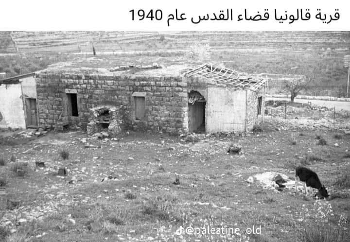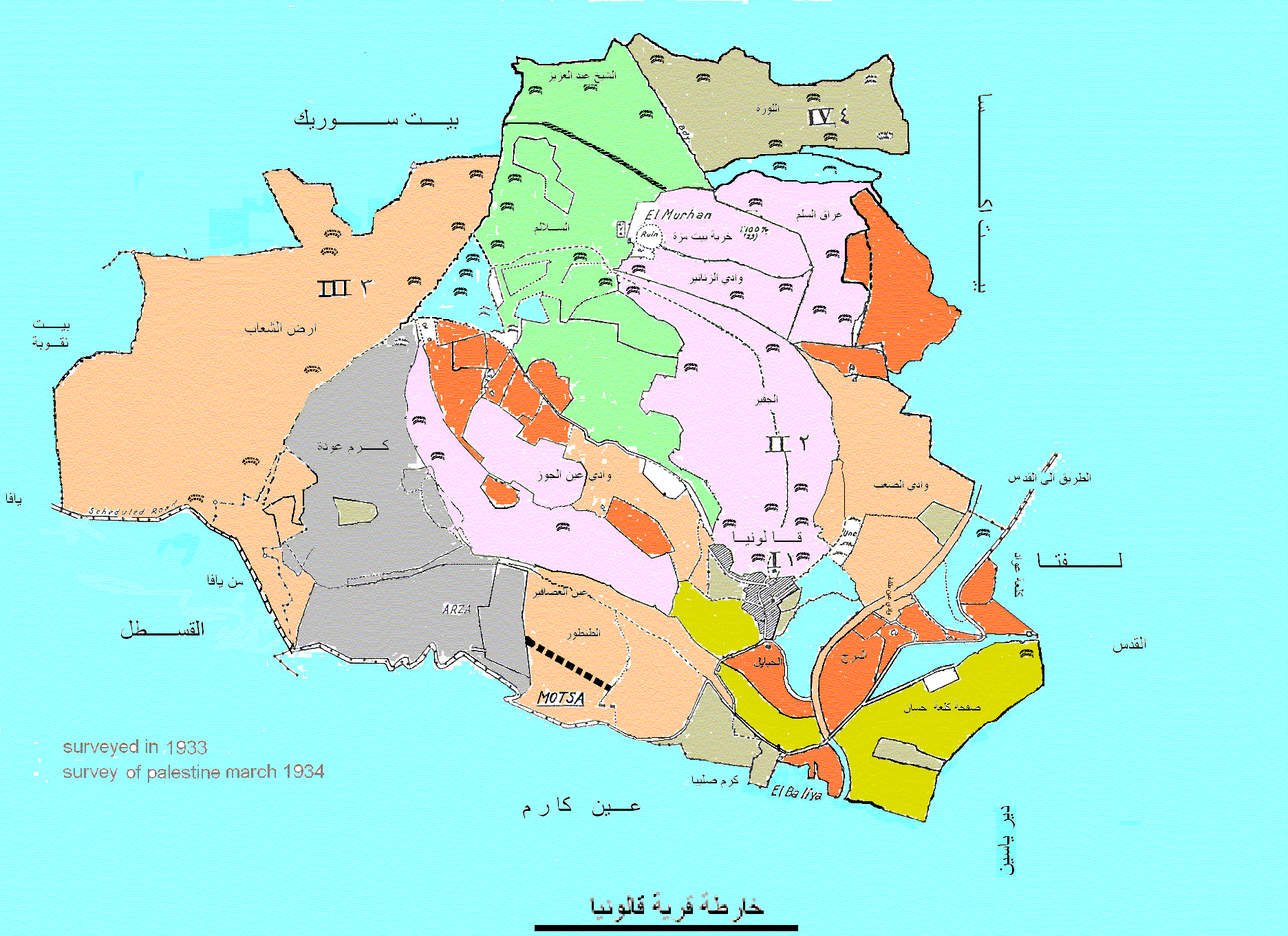 The village stood on a mountain slope, facing southwest; Wadi Qalunya passed through its eastern edge. The village lay on the Jerusalem−Jaffa highway, and a dirt path linked it to neighboring villages. Qalunya is identified with the Canaanite town of Mozah (Joshua 18:26); its name was found stamped on pottery handles in Tall al-Nasba (171143). After A.D. 71 Vespasian settled 800 Roman soldiers in the town, which became a Roman settlement known as Colonia Amosa or Colonia Emmaus. The word colonia produced the Byzantine name, Koloneia, for the site. The status of the site in the early Islamic period has not been established, but the name was preserved in Crusader times as Qalonie or Qalunia and in Arabic as Qalunya. Mujir aI-Din al-Hanbali (d. 1522) reported that in 1192 it was a village near Jerusalem. In 1596, Qalunya was a village in the nahiya of Jerusalem (liwa' of Jerusalem) with a population of 110. It paid taxes on a number of crops, including wheat, barley, and olives, as well as on other types of produce, such as goats, beehives, and molasses. In the late nineteenth century, Qalunya was a moderate-sized village perched on the slope of a hill, 300 feet above a valley. Travelers reported that it had a 'modern' restaurant. The villagers tended orange trees and lemon trees that were planted around a spring in the valley.