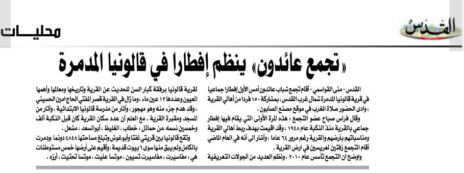 Ethnically Cleansing Qalunya was mostly emptied of its inhabitants because of nearby fighting on April 2nd, 1948, and upon occupatio it was completely cleansed.