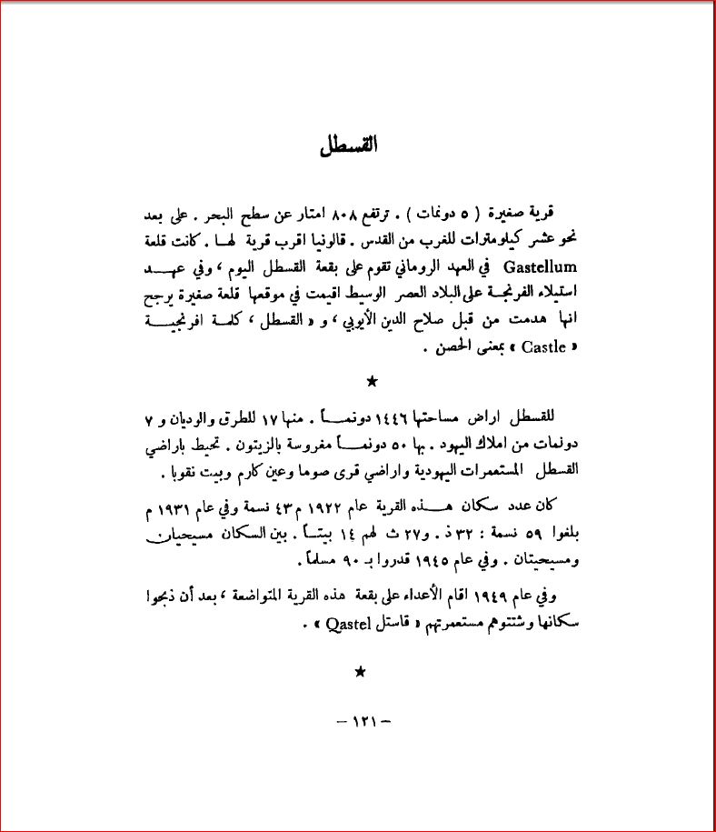 القرية قبل النكبة (كي لا ننسى للدكتور وليد الخالدي)كانت القرية تنتصب على قمة تل مرتفع مكور يطل على مساحات شاسعة من الجهات الأربع. وكانت تشرف من الشمال والشمال الشرقي على طريق القدس- يافا العام, الذي تربها به طريق فرعية. وموقعها هذا, المشرف على الطريق العام, منحها أهمية استراتيجية. ولقد شق اسم القرية من كلمة (كستلوم) اللاتينية التي كانت تشير إلى القلعة الرومانية القائمة في الموقع, والتي رممت أو أعيد بناؤها في العهد الصليبي ليطلق عليها اسم بلفير دي كرواز . في أواخر القرن التاسع عشر كانت القسطل قائمة على قمة تل صخري, يحف بها شرقا عدد من الينابيع. وقد صنف (معجم فلسطين الجغرافي المفهرس), الذي وضعته حكومة الانتداب البريطاني, القسطل مزرعة. وكان شكل القرية العام أشبه بنصف الدائرة, وكانت منازلها حجرية في معظمها. وقد امتدت الأبنية الأحداث عهدا على طول المنحدرات الشرقية لتلتف حول تل القسطل. وكان لسكان القرية, ومعظمهم من المسلمين, مقام لولي محلي يدعى الشيخ كركي, وذلك في الطرف الغربي من القرية. وكانوا يعتمدون على مدينة القدس المجاورة لتلبية معظم حاجاتهم, كما اعتمدوا على زراعة الحبوب البعلية والخضروات والثمار وأشجار الزيتون. وكانت أراضيهم الزراعية تتركز في شريط مستطيل يمتد إلى الجنوب الشرقي من القرية. في 1944\1945, كان ما مجموعه 42 دونما مزروعا بالحبوب, و169 دونما مرويا أو مستخدما للبساتين منها 50 دونما حصة الزيتون. إحتلال القرية وتطهيرها عرقياوقعت القسطل في قبضة الاحتلال قبل الشروع رسميا في عملية نحشون( أنظر بيت نقوبا, قضاء القدس) ويدعي المؤرخ الإسرائيلية بين موريس أنها كانت ( أول قرية عربية احتلتها الهاغاناه في حرب 1948, بهدف احتلالها احتلالا دائما) وهذه دعوى مشكوك في صحتها. هاجمت كتيبة البلماح الرابعة القرية في 3 نيسان \ أبريل واحتلتها. و كانت وحدة طليعية من المغاوير قد انقضت على القرية قبل بزوغ الفجر, ثم ما لبثت أن تلتها القوة الأساسية التي ظلت تصد الهجمات المضادة حتى الليل. وأفاد مراسل صحيفة (نيورك تايمز) أن المعارك استمرت في محيط القرية خلال الأيام القليلة اللاحقة, بينما تشير وثائق البلماح إلى أن الهجوم الأول لم يواجه بأية مقاومة, وأن المدافعين عن القرية وسكانها كانوا غادروها من قبل. أما المؤرخ الفلسطيني عارف العارف فيقول إن خمسين رجلا من مجاهدي القرية دافعوا عنها, ولم ينسحبوا إلا عند نفاذ ذخائرهم. ويؤكد تقرير ورد في صحيفة (فلسطين) أن سكان القرية غادروها عقب هجوم في منتصف آذار\ مارس, لكنه يقول إن هؤلاء الرجال خرقوا الحصار الذي فرضته قوات الهاغاناه وانسحبوا إلى قرية مجاورة. ووفق ما جاء في صحيفة (نيورك تايمز) فإن المحتلين التابعين للهاغاناه سيجوا مواقعهم بالأسلاك الشائكة, في 5 نيسان \ أبريل. وبعد يومين شرعوا في استخدام طائرات التدريب لقصف القوات الفلسطينية المحيطة بالقسطل بالقنابل. في 8 نيسان \ ابريل, استعاد المجاهدون الفلسطينيون القرية في معركة قتل خلالها زعيمهم , قائد منطقة القدس عبد القادر الحسيني. وتشير تقارير الهاغاناه إلى أن نفرا من القادة اليهود قتل أيضا في أثناء الانسحاب. وقد مرت أيام من القتال العنيف قبل الهجوم الفلسطيني المضاد, الذي شن في الساعة الواحدة والدقيقة الثلاثين ظهرا تحت غطاء من القصف المدفعي ونيران الرشاشات. وكتب مراسل صحيفة (نيورك تايمز): لقد تسلقوا المنحدرات الصخرية الوعرة الشديدة الانحدار وهم يطلقون صرخات الحرب). في الساعة الثالثة بعد الظهر دخلت قوة مؤلفة من عدة مجموعات من المجاهدين الفلسطينيين القرية. ومع ذلك فإن قوات البلماح ما لبثت أن استرجعها بهجوم بدأ ليل 8-9 نيسان\ أبريل. ولما اقتربت القوات من القرية هذه المرة فوجئت بها مقفرة, ذلك بأن المجاهدين الذين استردوا القسطل كانوا يشاركون في مأتم قائدهم الشهيد في مسجد الصخرة وقد طوقت قوات البلماح القرية ببعض الآليات المدرعة منعا لوصول التعزيزات ثم شرعت في اقتحامها. وتزامن هذا الهجوم مع الجزرة التي وقعت في دير ياسين
