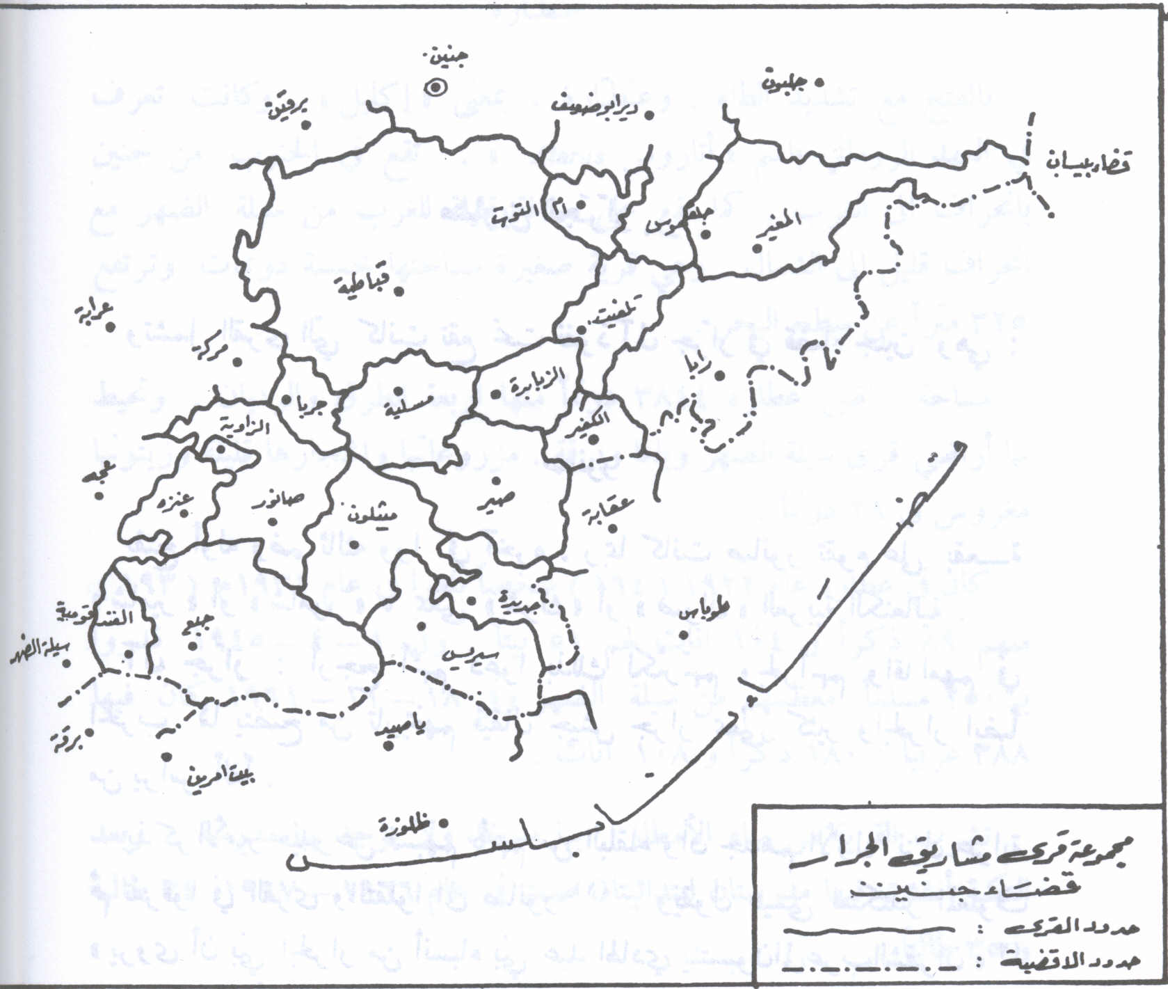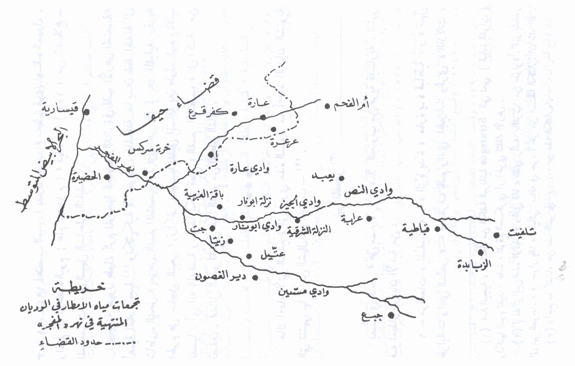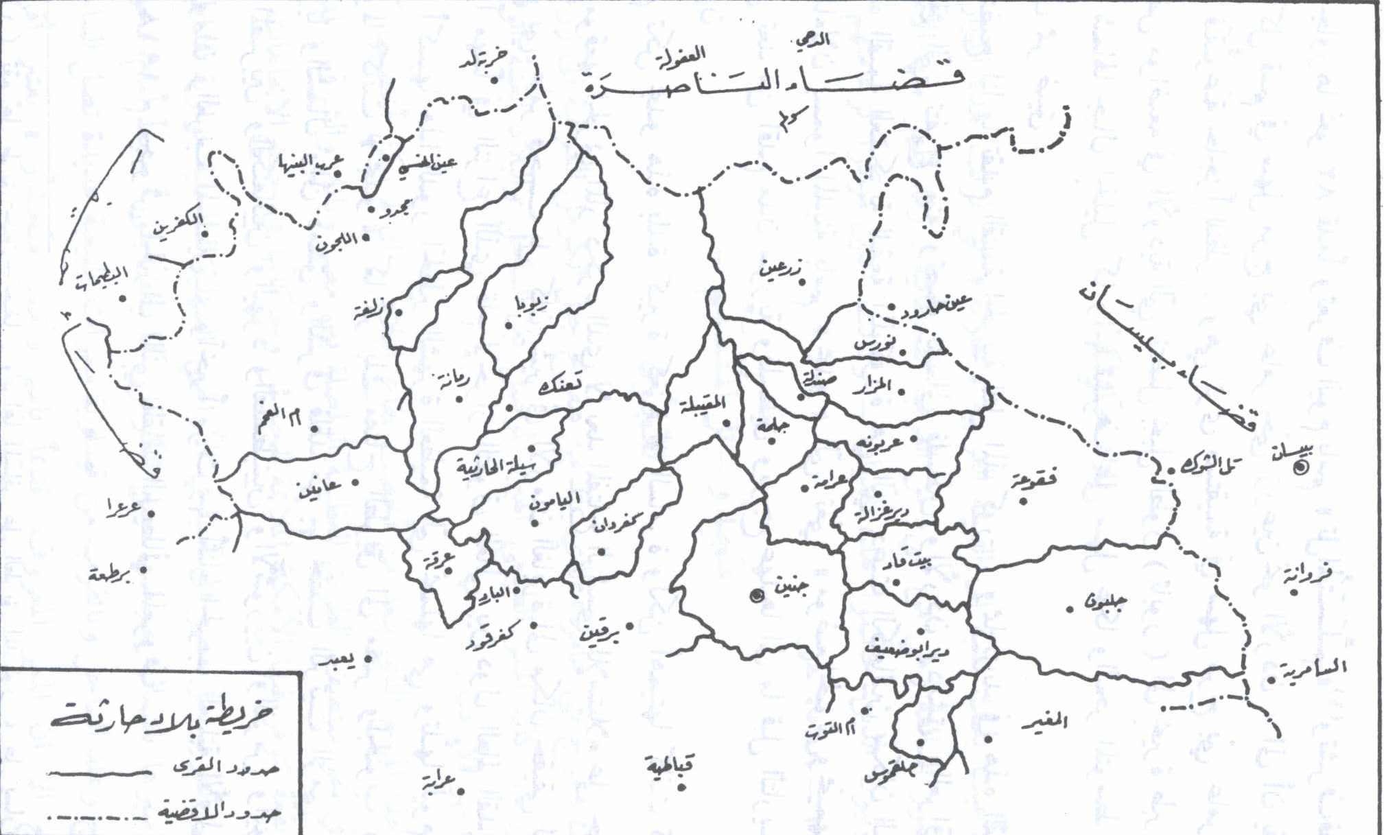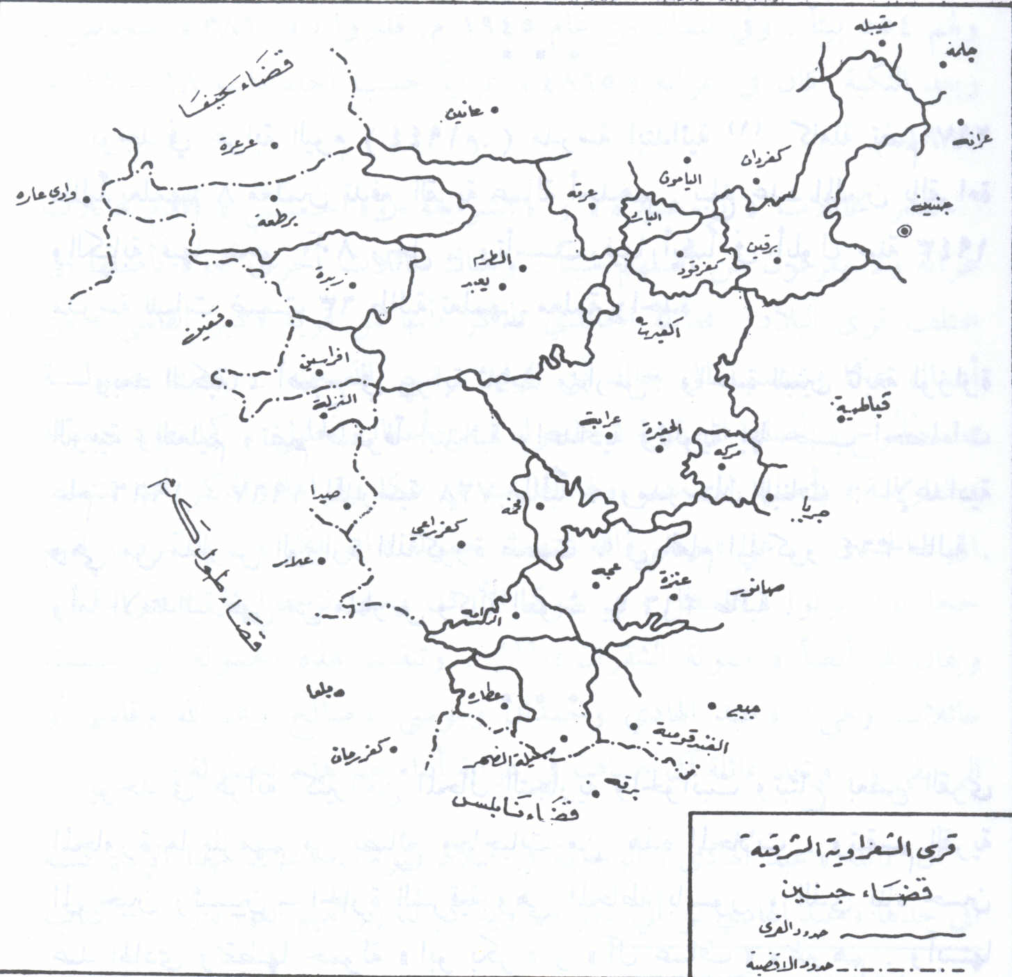 خرائط فلسطين: خارطة قضاء جنين توضح القرى (المهجرة والمدمرة) ومسار الاودية والانهر في القضاء |