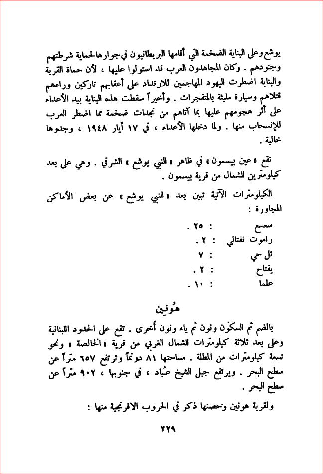 القرية قبل النكبة (كي لا ننسى للدكتور وليد الخالدي)كانت القرية قائمة على جبل عامل, على طرف منحدر يشرف على الشطر الشمالي من سهل الحولة, وقريبة جداً من الحدود اللبنانية. وقد كانت جزءاً حتى سنة 1923 , يوم رسمت بريطانيا وفرنسا الحدود اللبنانية ؟ الفلسطينية. وكان في هونين نبعان وخزان يقع في الركن الجنوبي الغربي من الموقع في سنة 1179 , شيد الصليبيون فيها قلعة كاستل نوف وهي التي وصفها الرحالة العربي ابن جبير الذي مر بالمنطقة سنة 1183 تقريباً, بأنها حصن لا يزال في يد الفرنجة وقد استسلم حماة القلعة لصلاح الدين الأيوبي في أواخر سنة 1187 . إلا إن الصليبين عادوا فاحتلوها في سنة 1240 , إلى أن طردهم منها آخر مرة السلطان المملوكي بيبرس في سنة 1266 . وذكر ياقوت الحموي (توفي سنة 1229 ) هونين باعتبارها قرية في جبال عاملة (جبل عامل اليوم ) كشرفة على الحولة كما أن الدمشقي (توفي سنة 1327)أتى إلى ذكر قلعة هونين التي كانت قصبة ناحية فيها قرى عدة. في أواخر القرن التاسع عشر, وصف الرحالة هونين بأنها قرية مبنية بالحجارة, مضمومة إلى قلعة صليبية خربة. وكانت القرية تقوم على حرف حبل قليل الارتفاع, وعدد سكانها نحو 100 نسمة (معظمهم من المسلمين ). ومع أن التلال المحيطة بالقرية كانت غير مزروعة, فقد كانت أراضي الوادي الأدنى منها تزرع. وكان في هونين مسجد ومدرسة ابتدائية للبنين . وكانت الزراعة عماد اقتصاد القرية, وفي موسم 1944/1945 , كان ما مجموعه 5978 دونماً مخصصاً للحبوب, و859 دونماً مروياً أو مستخدماً للبساتين. إحتلال القرية وتطهيرها عرقيااحتلت هونين كمعظم قرى تلك الناحية من الجليل الشرقي, في سياق عملية يفتاح (أنظر آيل القمح, قضاء صفد) التي نفذت في نيسان /أبريل ؟ أيار / مايو 1948 . وذكر تقرير أعدته الاستخبارات العسكرية الإسرائيلية لاحقاً أن سكان هونين غادروها في 3 أيار / مايو. في ذلك الوقت, لم تكن القوات الصهيونية وصلت إلى القرية. وقد زعم تقرير للبلماح أن القوات العربية أمرت سكان هونين بالرحيل عنها في 14 أيار / مايو. لكن هذين التقريرين لا يتفقان وذكريات شهود عيان أجريت مقابلات معهم بعد خمسة وعشرين عاماً.فقد ذكر بعض سكان قرية الخالصة المجاورة (5و2 كلم إلى الجنوب الشرقي) أنهم قرروا إجلاء النساء والأطفال إلى هونين صبيحة سقوط مدينة صفد (11أيار / مايو) . ولما احتلت الخالصة بعد بضعة أيام, انسحب المدافعون من سكانها إلى هونين مؤقتاً. والمرجح أن يكونوا انتقلوا إلى لبنان بعد أيام مع من اجتاز إلى لبنان من سكان هونين نفسها. ثمة اتفاق عام على الصورة الإجمالية, و أن تباينت الزاويات عن توقيف الإجلاء. وفي لاحق كتب قائد عملية يفتاح يغال ألون, الذي كان في وقت نفسه قائد البلماح, يقول: (كنا نعتبر من الضرورات القصوى تطهير المنطقة الداخلية من الجليل الأعلى كله) وقد تحقق بعض ذلك بالهجمات المباشرة, وبعضه الآخر باللجوء إلى الحرب النفسية. القرية اليوملا نزال المقبرة والمدرسة الابتدائية والقلعة الصليبية ماثلة للعيان. وقد باتت القلعة موقعاً أثرياً يجتذب السياح, ويستعمل الإسرائيليون المدرسة مستودعاً زراعياً. أما الأراضي المجاورة فيستغلها المزارعون الإسرائيليون. المغتصبات الصهيونية على اراضي القريةكانت مستعمرة مسغاف عام (201294 ) قد أ نشئت في سنة 1945 في الشطر الشمالي من أراضي القرية. وكان الهاجرون اليهود من العراق واليمن أنشأوا مستعمرة مرغليوت (201291 )على أراضي القريةفي سنة 1951 , جنوبي موقع القرية مباشرة. |