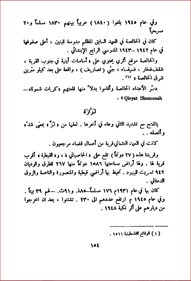 القرية قبل النكبة (كي لا ننسى للدكتور وليد الخالدي)كانت القرية في رقعة مستوية من الأرض بالقرب من نهر الحاصباني ,في الشطر الشمالي من سهل الحولة. في أواخر القرن التاسع عشر ,وصف الرحالة لزازة بأنها قرية مبنية بالطوب في سهل قريب من أحد الأنهر. وكان عدد سكانها 70 نسمة تقريباً وكان في القرية مدرسة ابتدائية خاصة بها بلغ عدد تلامذتها 26 تلميذاً في سنة 1945 .وكان سكان لزازة في معظمهم من المسلمين .وكانت أراضيهم خصبة و ملائمة للزراعة التي كانت أهم موارد رزقهم. وكان البصل و الفاكهة و الذرة أهم محاصيلهم ,إن كانوا يعنون فضلا عن ذلك بتربية المواشي والنحل وبصيد السمك في 1944/1945, كان ما مجموعه 95 دونما مخصصا للحبوب, 2235 دونماً مروياً أو مستخدماً للبساتين. إحتلال القرية وتطهيرها عرقيايعزى نزوح سكان لزازة عنها الى (حملة الشائعات)صورة من صور الحرب النفسيةالتي خطط لها قائد البلماح ,يغال ألوان ونفذت في إطار عملية يفتاح (أنظر آبل القمح ,قضاء صفد )فاستناداً الى المؤرخ الإسرائيلي بني موريس كانت التهديدات تبث بين سكان قرى الجليل الشرقي في الوقت الذي كانت عملية يفتاح تأخذ طريقها الى التنفيذ .لكن ثمة بعض الشكوك في صحة هذه الرواية.فقد هرب سكان لزازة وبحسب ما روي يوم 21 أيارمايو 1948 في حين كانت (حملة الشائعات تنفذ قبل ذلك بين 10 و 15 أيار /مايو بحسب ما ذكر ألوان نفسه). القرية اليوملم يبق إلا بعض الحجارة المبعثرة في أنحاء الموقع .أما الأراضي المجاورة ,فيزرعها سكان مستعمرة بيت هيلل. المغتصبات الصهيونية على اراضي القريةكانت مستعمرة بيت هيلل (206290 )قد أنشئت في سنة 1940 شمالي غربي موقع القرية مباشرة ,لكن لا على أراضيها. |