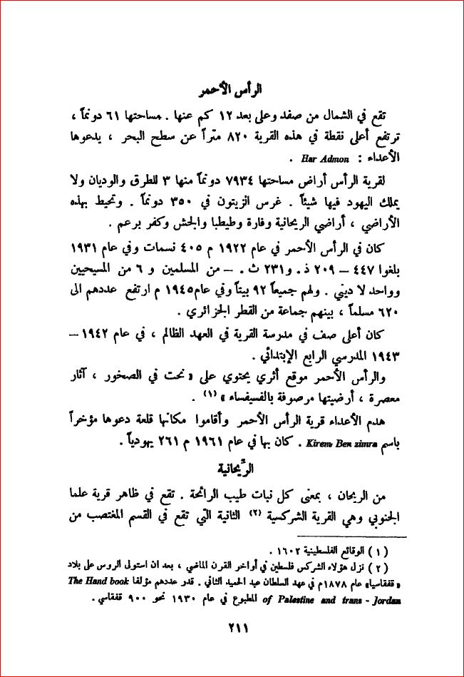 القرية قبل النكبة (كي لا ننسى للدكتور وليد الخالدي)كانت القرية مبنية على قمة الراس الأحمر المستوية. وكانت الطريق غير المعبدة التي تربطها بصفد تمر أيضاً بقرية طَيْطَبا في الجنوب. كما كانت طريق غير معبدة أخرى تتفرع من طريق صفد-كفر برعم، وتربطها بقريتي طيطبا والريحانية في الشمال. في سنة 1596، كانت الراس الأحمر قرية في ناحية جيرة (لواء صفد)، وعدد سكانها 418 نسمة. وكانت تؤدي الضرائب على عدد من الغلال كالقمح والشعير، بالإضافة إلى عناصر أُخرى من الانتاج والمستغلات كالماعز وخلايا النحل وكروم العنب ومعصرة تستعمل لعصر الزيتون أو العنب. في أواخر القرن التاسع عشر، وصف الرحالة الراس الأحمر بأنها قرية مبنية بالحجارة على تل مرتفع حيث أقام القرويون بساتينهم. كما قُدر عدد سكانها بما يتراوح بين 150 و350 نسمة. وكان لا بد من أن تمتد أية أبنية جديدة في اتجاه الجنوب، نظراً إلى شدة انحدار سفوح التل من جهات الشمال والشرق والغرب. كان سكان القرية كلهم من المسلمين، ولهم فيها مدرسة ابتدائية للبنين أُسست أيام الانتداب البريطاني. وكان في الركن الشمالي من القرية نبع يستمد سكانها المياه منه للاستخدام المنزلي. وكانوا يستنبتون الحمضيات وغيرها من الفاكهة في الأراضي الواقعة شمالي القرية. في موسم 1942/1943، كان ثمة إلى الشمال الغربي والجنوب الغربي والجنوب الشرقي من القرية، 350 دونماً مزروعاً شجر زيتون. وفي 1944/1945، كان ما مجموعه 4728 دونماً مخصصاً للحبوب، و1008 من الدونمات مروياً أو مستخدماً للبساتين. وكان آثار الراس الأحمر، كالفسيفساء ومعاصر العنب المرصعة أرضها بالفسيفساء، تقوم أدلة على أن الموقع كان آهلاً أيام الرومان أو البيزنطيين. إحتلال القرية وتطهيرها عرقياهاجمت القوات الإسرائيلية القرية في 30 تشرين الأول/أكتوبر 1948. ويُفهم من كلام المؤرخ الإسرائيلي بِني موريس أن السكان هربوا عندما سمعوا أنباء المجازر التي ارتكبت الليلة السابقة في صفصاف والجش. وكانت الراس الأحمر تقع شمالي هاتين القريتين مباشرة، وقد استولت عليها وحجات من لواء شيفع (السابع) في أثناء عملية حيرام. وعندما وصلت وحدات هذا اللواء، الذي ارتكب فظائع عدة في أثناء تلك العملية، إلى قرية الراس الأحمر وجدتها خالية من سكانها؛ وذلك استناداً إلى تقارير إسرائيلية يستشهد موريس بها. والأرجح أن السكان نزحوا إلى لبنان مثل معظم سكان الجليل الشمالي. واصلت القوات الإسرائيلية، العاملة في المنطقة، تقدمها داخل الأراضي اللبنانية. وقد ذكرت صحيفة ((نيويورك تايمز))، في الأسبوع الأول من تشرين الثاني/نوفمبر، أن الوحدات الإسرائيلية استولت على نحو خمس عشرة قرية لبنانية، بعضها يقع على بعد 10 كلم داخل الأراضي اللبنانية. وبحلول أيار/مايو 1949، كانت القرية الخالية قد سميت باسم جديد هو كيرم بن زمرا، وكانت تُعد لاستقبال المهاجرين اليهود. القرية اليوممازال بعض المنازل قائماً. ولأحد المنازل درج أمامي، ومرآب سيارة مسقوف أضافه الإسرائيليون الذين يقيمون فيه، على ما يظهر. ولمنزل آخر نافذتان عاليتان مقنطرتان. وتتبعثر أنقاض حجرية من المنازل المدمرة في أرجاء الموقع، وينبت فيه بضع شجرات تين وقليل من نبات الصبار. ويزرع سكان المستعمرة المجاورة بعض الأراضي القريبة، ويستخدمون الباقي مرعى للمواشي. المغتصبات الصهيونية على اراضي القريةفي سنة 1949، أنشأت إسرائيل مستعمرة كيرم بن زمرا على أراضي القرية، إلى الشرق مباشرة من موقعها إن لم يكن فيه. |
