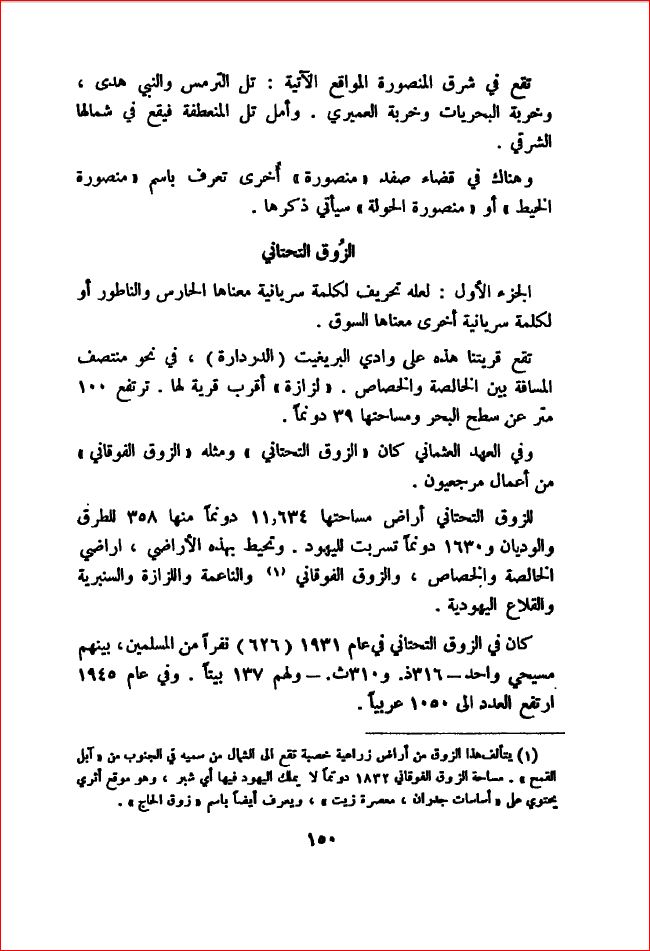 القرية قبل النكبة (كي لا ننسى للدكتور وليد الخالدي)كانت القرية تقوم على تل وتواجه مساحات واسعة ومكشوفة من الجهات كلها؛ وكان جبل الشيخ يلوح من جهة الشمال الشرقي. وكانت طريق فرعية تصل الزوق التحتاني بالطريق العام المفضي إلى صفد وطبرية، وكانت طرق ممهدة تصلها بالقرى المجاورة. أما أصل القسم الأول من الاسم، الزوق، فلا يُعرف على وجه الدقة؛ ومن الجائز أن يكون متحدراً من كلمة ((زوق)) (zuk) السريانية، التي تعني ((بلدة)). وأما القسم الثاني من الاسم، التحتاني، فلتمييزها من سميتها الزوق الفوقاني، الواقعة إلى الشمال الغربي منها. في أواخر القرن التاسع عشر، كانت الزوق التحتاني قرية مبنية بالحجارة والطين، ومحاطة بالأراضي الزراعية. وكان عدد سكانها 100 نسمة تقريباً. وكان ثمة طاحونة وبعض المنازل العربية الخربة والأقدم عهداً في الناحية الشمالية، كما كان ثمة مسيل مياه كبير بالقرب منها. في سنة 1931، كان سكان الزوق التحتاني يتألفون من 626 مسلماً ومسيحي واحد؛ ولا توجد معلومات دقيقة فيما يتعلق بسنة 1945، لكن سكان القرية كانوا في معظمهم من المسلمين. وكانوا يستمدون مياه الاستخدام المنزلي من واد مجاور، ويشغلون الطواحين بالقوة المائية شمالي القرية. وكانوا يعملون أساساً في الزراعة، فيزرعون الحمضيات وسواها من الفاكهة، ولا سيما في الأراضي الممتدة جنوبي القرية. في 1944/1945، كان ما مجموعه 2145 دونماً مخصصاً للحبوب، و5547 دونماً مروياً أو مستخدماً للبساتين. وكانت الزوق التحتاني تعد موقعاً أثرياً؛ فهي عبارة عن رابية اصطناعية يبرز على سطحها بعض أسس الأبنية القديمة والدارسة. وفي الإمكان رؤية بقايا حظائر مبنية بالحجارة من دون طين، وشظايا من الفخار، على سطح أرضها. إحتلال القرية وتطهيرها عرقيازعمت مصادر عسكرية إسرائيلية، في تقرير لها سنة 1948، أن سكان الزوق التحتاني هجروا منازلهم في 11 أيار/مايو 1948، من جراء سقوط صفد في اليوم السابق. ولا يبين المؤرخ الإسرائيلي بِني موريس، الذي يستشهد بالتقرير، هل شنت غارة إسرائيلية على القرية في سياق عملية يفتاح أم لا، ولا هو يذكر متى دخلت القوات الإسرائيلية القرية فعلاً. القرية اليوملم يبق إلا منزل حجري واحد، وهو يستعمل مكتباً لمدرج طائرات. والعشب والنباتات البرية التي تغطي الموقع مجزوزة. وثمة تنقيبات أثرية جارية في تل الواويات، الواقع عند الطرف الجنوبي للموقع. وثمة، إلى الغرب من هذا التل الأثري، رقعة مسيجة فيها كثير من نبات الصبار وأشجار الكينا الباسقة. والعمل جار لإنشاء مدرج جديد إلى الشمال الشرقي من موقع القرية. المغتصبات الصهيونية على اراضي القريةأنشأ الصهاينة مستعمرة بيت هيلّل جنوبي القرية في سنة 1940. ويف سنة 1944، دُمجت الأرض التي تقوم بيت هيلّل عليها دمجاً إدارياً في أراضي قرية لزّازة المجاورة. إلا أن خرائط مسح الأراضي اللاحقة لذلك التاريخ تبيّن أن بيت هيلّل قائمة على أراض تابعة للزوق التحتاني؛ وهي تقع على بعد نحو كيلومترين جنوبي شرقي موقع القرية. |