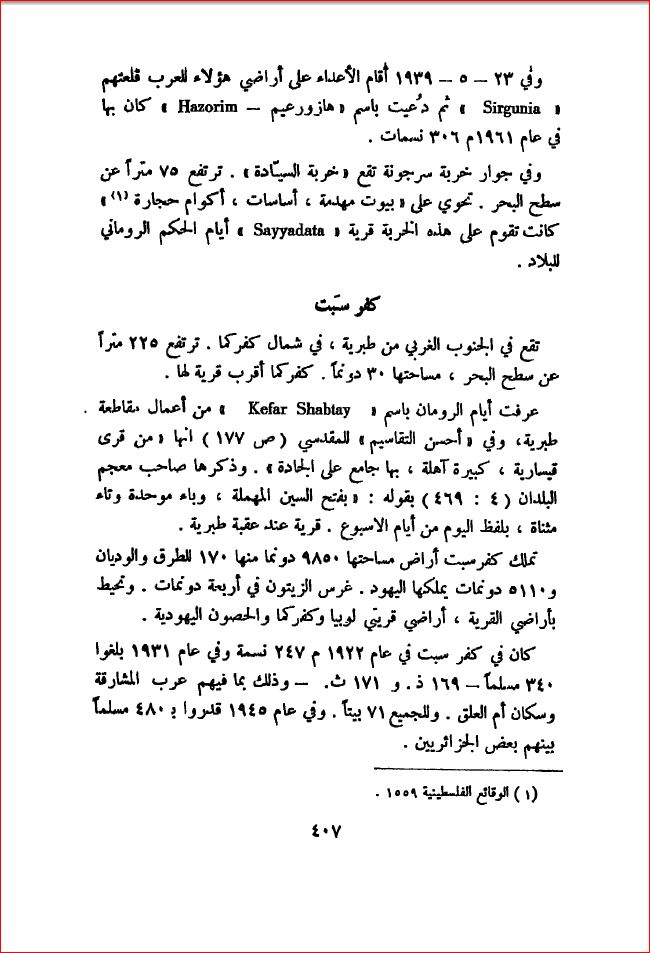 القرية قبل النكبة (كي لا ننسى للدكتور وليد الخالدي)كانت القرية تقع في سهل متدرج الانحدار في الجليل الشرقي الأسفل وكانت تشرف على وادي من جهة الشمال وعلى مناطق مستوية نسبيا من الجهات الأخرى وكانت طريق فرعية تربط القرية بكفر كما (وهي قرية فلسطينية ومازالت قائمة) ومنها بطريق طبرية- الناصرة العام. في العهد الروماني كانت كفرسبت تعرف باسم كفار شبتاي وقد ذكرها الجغرافي العربي المقدسي (توفي سنة 990 تقريبا), وفي جملة قرى قيسارية فقد قال أنها كانت قرية آهلة ولها مسجد في شارعها العام . كما أتى ياقوت الحموي(توفي سنة1229) الى ذكرها فقال أنها قرية قرب طبرية وقد دعاها الصليبيون كفرسبت في سنة 1596, كانت كفر سبت قرية في ناحية طبرية (لواء صفد) وعدد سكانها 160 نسمة. وكانت تؤدي الضرائب على عدد من الغلال كالقمح والشعير والقطن بالإضافة الى عناصر أخرى من الإنتاج والمستغلات كالماعز وخلايا النحل في أواخر القرن التاسع كانت كفر سبت قرية مبنية بالحجارة ومحاطة بالأراضي الزراعية المستوية وعدد سكانها 300 نسمة تقريبا وكانت القرية على شكل مستطيل قليل العرض يمتد من الشرق الى الغرب وكانت منازلها المتراصفة بعضها الى بعض مبنية من مواد متنوعة منها الحجارة والطين والاسمنت. وكانت القرية تستقبل أيضا قوما من قبيلة عرب المشارفة البدوية, فيضربون خيامهم هناك. وكان سكان القرية من المسلمين, ويعتمدون على الزراعة وتربية المواشي في كسب رزقهم. وكان أهم محاصيلهم الحبوب والثمار التي كانوا يستنبتونها في الشطر الجنوبي الشرقي من القرية في 1944\1945, كان ما مجموعه 4258 دونما مخصصا للحبوب و7 الدونمات مرويا أو مستخدما للبساتين. كان ثمة في جوار القرية خرب عدة منها خربة أم العلق (194239)التي كانت امتداداً للقرية نفسها, واشتملت على أطلال منازل وقلعة ومسجد وصهاريج وقطع أعمدة, كما كانت تشتمل على أسس أبنية دارسة ومعاصر زيتون. إحتلال القرية وتطهيرها عرقيااستنادا الى المصادر الإسرائيلية فان سكان القرية نزحوا في 22 نيسان \ ابريل 1948 من جراء استيلاء الهاغاناه على طبرية في 18 نيسان\ابريل. القرية اليومإن المصاطب الحجرية وأكوام الحجارة هي أهم الدلائل على انه كان ثمة قرية في الموقع وينمو بين الأنقاض شجرات متفرقة وقليل من نبات الصبار. أما الأراضي المحيطة بالموقع فتزرع حبوباً وأشجارا مثمرة ولوز. المغتصبات الصهيونية على اراضي القريةفي سنة 1949 صارت أراضي القرية موضع خلاف بين مستعمرتين إسرائيليتين متاخمتين لها في المنطقة: ايلانيا (188240) وشارونا (194236) وكانت الأولى قد طالبت بالتعويض من هجمات العرب عليها في الأشهر الأولى من الحرب وخصت ب350 دونما من أراضي كفرسبت التي كانت ملكاً ل(مدمرينا) بحسب ما قالوا لكن مزارعي شارونا كانت لهم مطامعهم في أراضي القرية أيضا فاستولوا عليها بالقوة وقد تدخلت وزارة الزراعة فأمرت مزارعي شارونا بمغادرة الأرض. في سنة 1949 أنشأت إسرائيل مستعمرة سدي ايلان (189239) الى الغرب من موقع القرية لكن لا على أراضيها. |