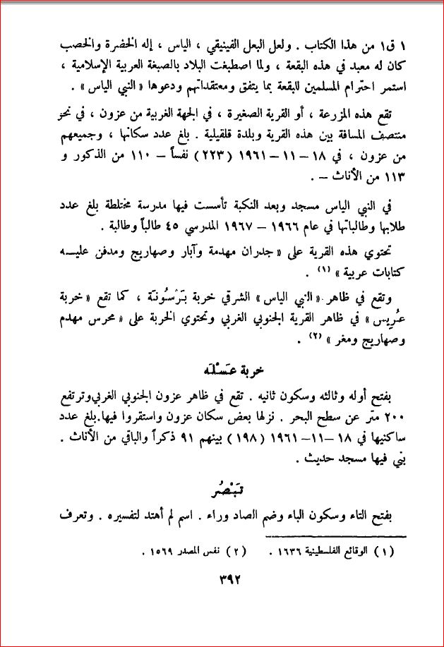 القرية قبل النكبة (كي لا ننسى للدكتور وليد الخالدي)كانت القرية تنهض على ارض متموجة في السهل الساحلي وكانت متصلة ببلدة قلقيلية التي تبعد نحو 8كلم الى الشرق بواسطة طريق فرعية تتقاطع مع الطريق العام الساحلي على مسافة قصيرة من القرية. وقد بنيت تبصر قبل أواسط القرن التاسع عشر فوق موقع اثري. في أواخر القرن التاسع عشر كانت نبصر مزرعة متوسطة الحجم - وقد صنفت لاحقا بهذه الصفة في (معجم فلسطين الجغرافي المفهرس) في ركنها الشمالي بئر وكانت القرية على شكل مستطيل يمتد من الشمال الى الغرب ومنازلها مبنية بالطين والاسمنت, في فترة الانتداب البريطاني انشأ سكان القرية مدرسة ابتدائية للبنين وكان في القرية أيضا بضعة دكاكين وكان سكان تبصر يتزودون مياه الشرب من آبار تقع في جوار موقع القرية ولاسيما من بئر في الناحية الشمالية وكانت الزراعة تعتمد على الحبوب والبقول والبطيخ والخيار. في 1944 \1945 كان ما مجموعه 1602 من الدونمات مخصصا للحبوب و24 دونما مرويا أو مستخدما للبساتين وكانت القرية تشتمل على آثار قديمة منها أسس بناء دارس وبئر وقطع من أرضية فسيفساء وقبور. إحتلال القرية وتطهيرها عرقياكانت تبصر استنادا الى المؤرخ الإسرائيلي بني موريس أولى القرى التي هجرها سكانها هجرة جماعية في منطقة تزدحم بالمستعمرات اليهودية الى الشمال من تل أبيب مباشرة فقد رحل معظم السكان فيما ذكر منذ 21 كانون الأول ديسمبر 1947 خوفا من هجمات اليهود ومع أن غارات عدة شنت في تلك المنطقة في الأسابيع القليلة السابقة فليس ثمة من ذكر لغارة على تبصر تحديدا الا أن هناك من دلائل ما يشير الى إن بعض السكان على الأقل مكث في القرية مدة ثلاثة اشهر أخرى, حتى نيسان \ ابريل. وفي ذلك التاريخ طرد بعض السكان من تبصر بأمر من الهاغاناه في عملية (التطهير) النهائي لتلك المنطقة الساحلية وذلك استنادا الى تقرير للاستخبارات العسكرية الإسرائيلية (انظر خربة الشونة , قضاء حيفا). القرية اليومتغطي بساتين الحمضيات الإسرائيلية الموقع بأسره بحيث أصبح من الصعب التميز بينه وبين الأراضي المجاورة. وتنبت أشجار الحمضيات والسرو على أراضي القرية. المغتصبات الصهيونية على اراضي القريةفي سنة 1921 انشأ الصهيونيين مستعمرة رعنانا (138176) جنوبي القرية بعيد الحد الفاصل بين قضائي يافا طولكرم ثم توسعت لتكون بلدة بات بعض ضواحيها يقع على أراضي القرية وتقع مستعمرة باتسرا (138179) التي أسست سنة 1946 على أراضي القرية الى الشمال من موقعها. |
