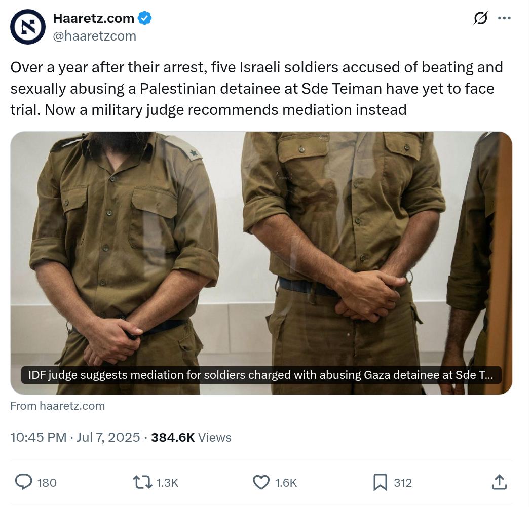 Here is Ha'aretz reporting on the systematic rape of Palestinian prisoners at Sde Teiman (the Israeli version of Abu Ghraib). In the worst-case situation, the rapists got a slap on the wrist. Let us not be too critical of the most moral army, the American soldiers (men and women) did far worse to thousands of Iraqi prisoners at Abu Ghraib