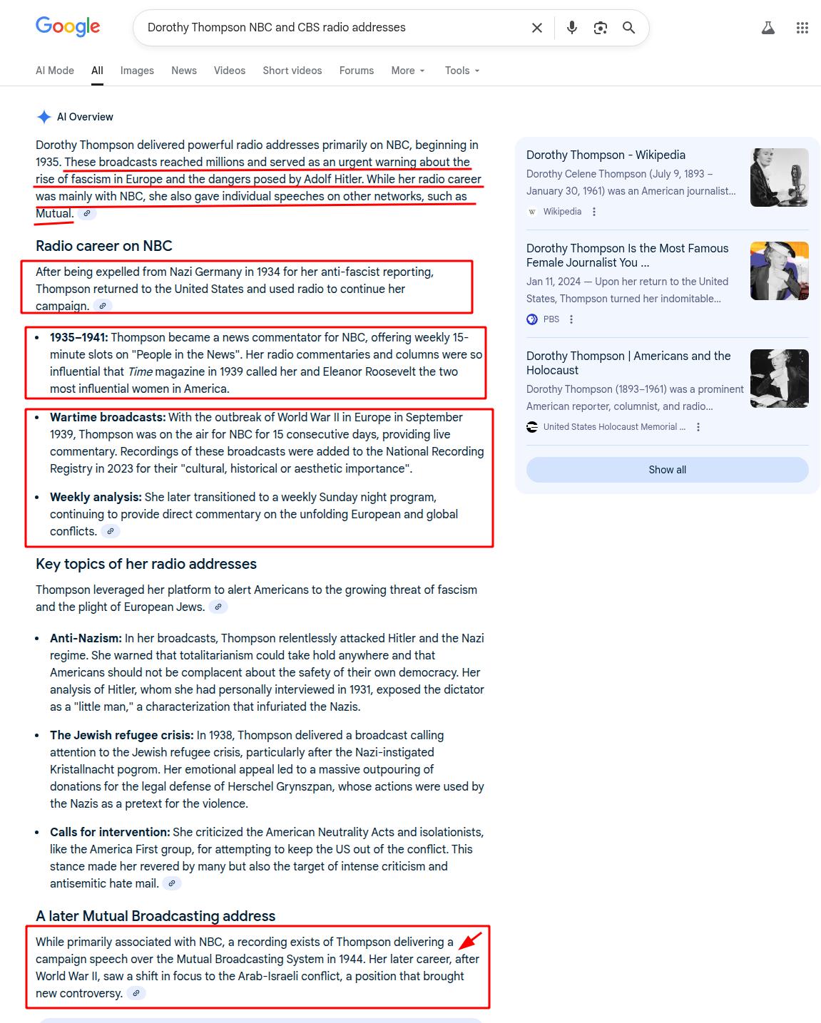 One of the most striking details often overlooked in her biography is Thompson’s wartime activity. During WWII, she was not merely a columnist; she became a radio voice to Europe, broadcasting directly to Germans and others under Nazi rule. She sought to counter Goebbels’ propaganda with her own appeals, exposing Nazi crimes and reminding listeners of universal values. Her NBC and CBS radio addresses reached tens of millions in America and Europe. She exposed Nazi atrocities, countering Goebbels’ propaganda, and was one of the few American voices to speak openly of extermination before most Jewish organizations dared to (Thesis: UVM, 2009, p. 72–75).