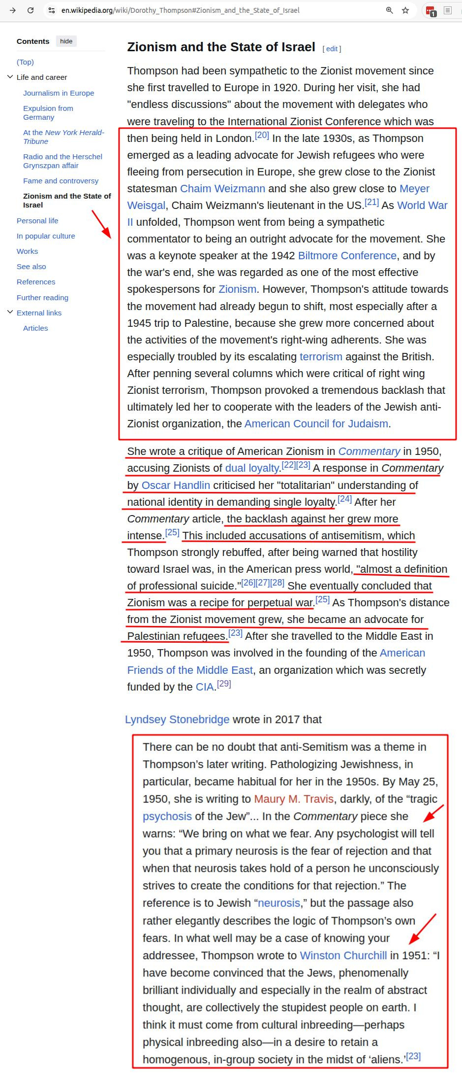Sadly, the US Holocaust Memorial only recognized Ms. Thompson's efforts as late as 2019, way after Dorothy died. To be honest, USHMM's page was fair about Dorothy's role before & during WWII, although it was scrubbed clean from any criticism of Zionism. On the other hand, what is the point if a webpage, when it was written way after Ms. Thompson was chewed and branded as an antisemite like Hitler! It should be emphasized that the Bergson Group (the only Jewish group to lobby for rescuing European Jewry) had a similar fate during WWII. Old habbit die hard; why change a winning formual: weaponize antisemitim when it serves Zionists' interests!