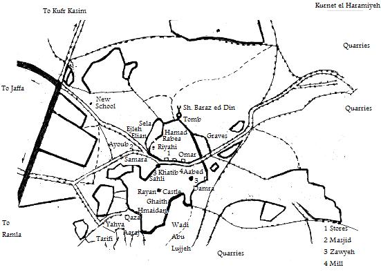 كانت القرية أشبه شكلاً بمتوازي الأضلاع. وكانت منازلها، المبنية بالطين والتبن أو بالحجارة والأسمنت، متقاربة بعضها من بعض ولا تفصل بينها إلا أزقة ضيقة. وكانت كل حارة من حاراتها آهلة بـ((حمولة)) من الحمائل، وتضم ديواناً لاستقبال الضيوف وللاستقبالات عامة. وكان سكان القرية في معظمهم من المسلمين، ولهم فيها مسجد (بُني سنة 1935) وعيادة طبية ومدرسة أُسست في سنة 1888 أيام العثمانيين، وأعيد فتحها في سنة 1920. وفي أواسط الأربعينات كان يؤم هذه المدرسة 147 تلميذاً.