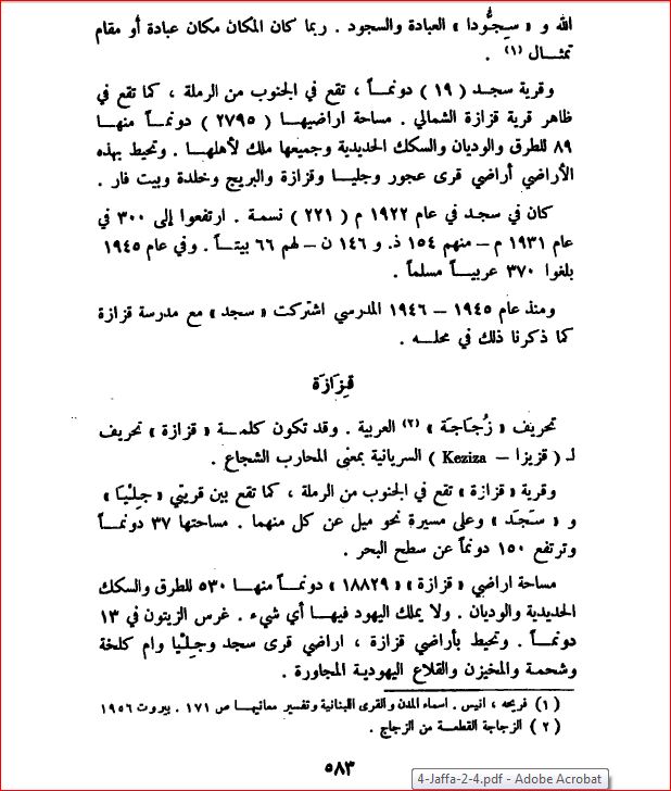 القرية قبل النكبة (كي لا ننسى للدكتور وليد الخالدي)كانت القرية مبنية في منطقة كثيرة التلال على الطرف الشرقي للسهل الساحلي الأوسط. وكان طريقان فرعيتان تصلانها بالطريق العام الممتد بين غزة وطريق الرملة- القدس العام؛ وكانت إحدى هاتين الطريقين تصل إلى محطة سكة وادي الصرار (على خط سكة الحديد الممتد بين الرملة والقدس) التي تبعد 3 كلم على خط مستقيم إلى الشمال. وقد روى رحالة أوروبي أنه مرّ بقزازة، في الستينات من القرن الماضي، وهو طريقه لتفحص تل مجاور لها. كانت القرية، ذات الشكل المستطيل الممتد على محور شمالي جنوبي، تنقسم إلى قسم شمالي وقسم أوسط (وهو أقدم أقسام القرية) وقسم جنوبي. وكانت منازلها، المبنية بالأسمنت والحجارة والطين، متجمهرة بعضها قرب بعض. وكان لسكان قزازة- المسلمين في معظمهم- مسجد، ولبعضهم دكاكين. وقد أُنشئت في قزازة مدرسة ابتدائية في سنة 1922. ثم أنشأ سكان قزازة وسجد وجليا مدرسة مشتركة للقرى الثلاث، كان يؤمها 127 تلميذاً وقت تأسيسها في سنة 1945. وكان اقتصاد القرية يعتمد على الزراعة البعلية، وقوامها الحبوب والخضروات والفاكهة. في 1944/1945، كان ما مجموعه 11757 دونماً مخصصاً للحبوب، و131 دونماً مروياً أو مستخدماً للبساتين. إحتلال القرية وتطهيرها عرقياأو هجوم دُوّن خبره وقع في الصباح الباكر من يوم 20 كانون الأول/ديسمبر 1947، بحسب ما جاء في تقارير الصحف. فبُعيد منتصف الليل اقتربت مجموعة من المهاجمين الصهيونيين من مشارف القرية، وأطلقت النار عليها. واستمر إطلاق النار متقطعاً ثلاث ساعات، ثم عقبه وابل من القنابل اليدوية. وذكرت صحيفة ((فلسطين)) أن سكان القرية ردوا على إطلاق النار بالمثل. وقدرت الشرطة البريطانية أن قروياً قتل في أثناء تبادل إطلاق النار، وأن اثنين آخرين جرحا، بينهما امرأة؛ وقالت الهاغاناه أن خسائر العرب ((أكثر من هذا كثيراً)). وقد حاولت الشرطة تعقّب المهاجمين، وفق ما ذكرت ((نيويورك تايمز)) لكنها أخفقت. في 9-10 تموز/يوليو 1948، اجتاحت وحدات من لواء غفعاتي القرية في هجوم شُنّ مع نهاية الهدنة الأولى. وكان من الأهداف المعلنة لعملية أن-فار طرد أكثر من 20000 نسمة من سكان منطقة تمتد على شكل الهلال جنوبي الرملة. ويشير ((تاريخ حرب الاستقلال)) إلى ((عمليات تطهير في مؤخر اللواء، لإزالة التهديد والخطر الماثل في وجود تجمعات سكنية عربية في مؤخر الجبهة)). لكن المؤرخ الإسرائيلي بِني موريس يزعم أن طرد المدنيين طرداً مباشراً لم يكن ضرورياً، لأنهم كانوا يفرّون من تلقاء أنفسهم مع اقتراب الطوابير الإسرائيلية من قراهم. وقد هُجّر سكان قزازة، كغيرهم من سكان المنطقة، صوب منطقة الخليل في أرجح الظن. القرية اليوميقع الموقع داخل منطقة عسكرية مغلقة. المغتصبات الصهيونية على اراضي القريةتقع مستعمرة تيروش، التي أُسست في سنة 1955، قريبة من موقع القرية، لكنها مبنية على أرض تابعة لقرية عجور المهدمة والواقعة في قضاء الخليل، خارج حدود قضاء الرملة. والموقع نفسه قاعدة عسكرية مسيجة، ومحظور دخولها. |